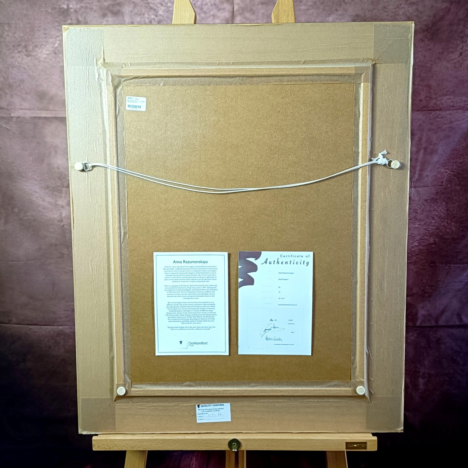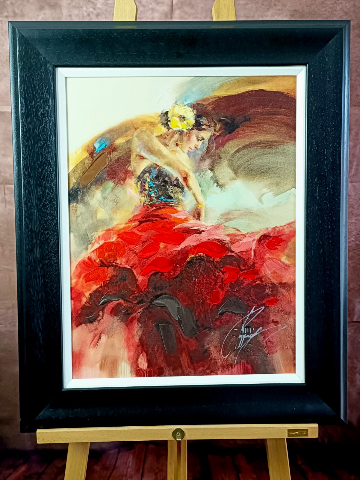 The product is a hand embellished limited edition print by artist Anna Razumovskaya, titled "Red Passion I". This medium-sized portrait features a female dancer in a vibrant red colour scheme. The print is signed by the artist and comes with a certificate of authenticity issued by DeMontfort Fine Art. The framed artwork is made on board and is part of a limited edition series of 50 pieces, making it a unique and collectible piece for art enthusiasts.