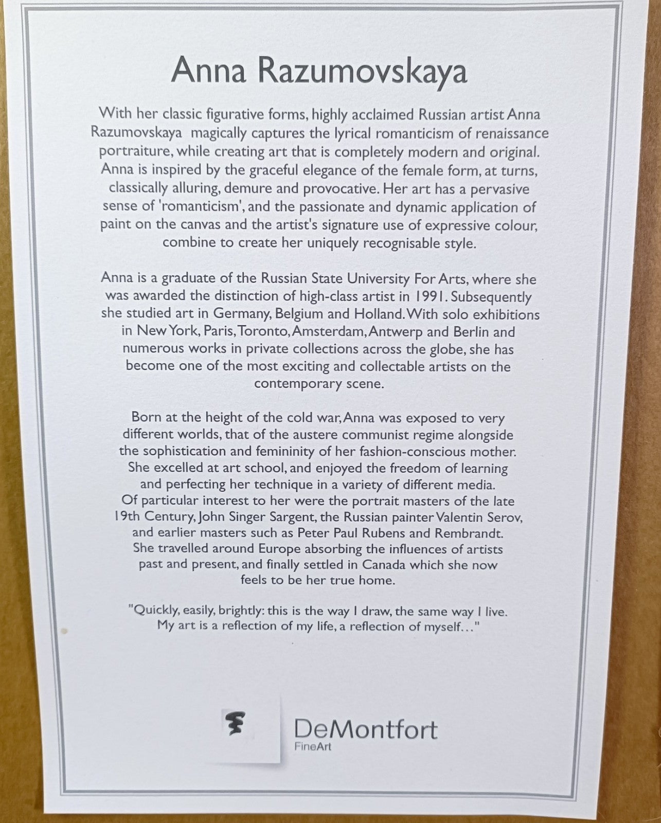 Anna Razumovskaya is a highly celebrated artist whose paintings feel like a quiet conversation between classical beauty and modern expression. She's known for her captivating female figures, often dancers or musicians, painted with a dynamic and passionate touch.