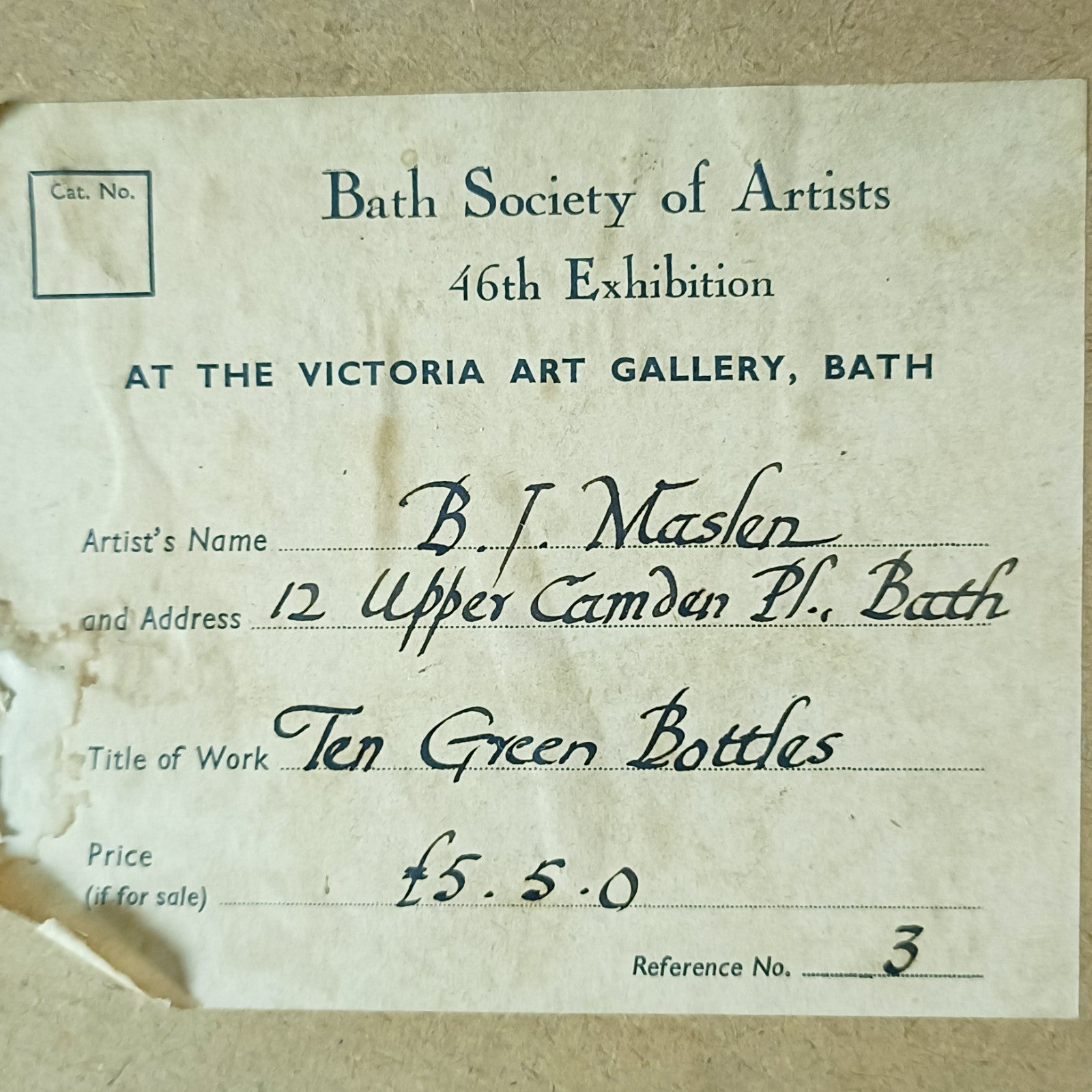 Label for the Bath Society Of Artists to the verso