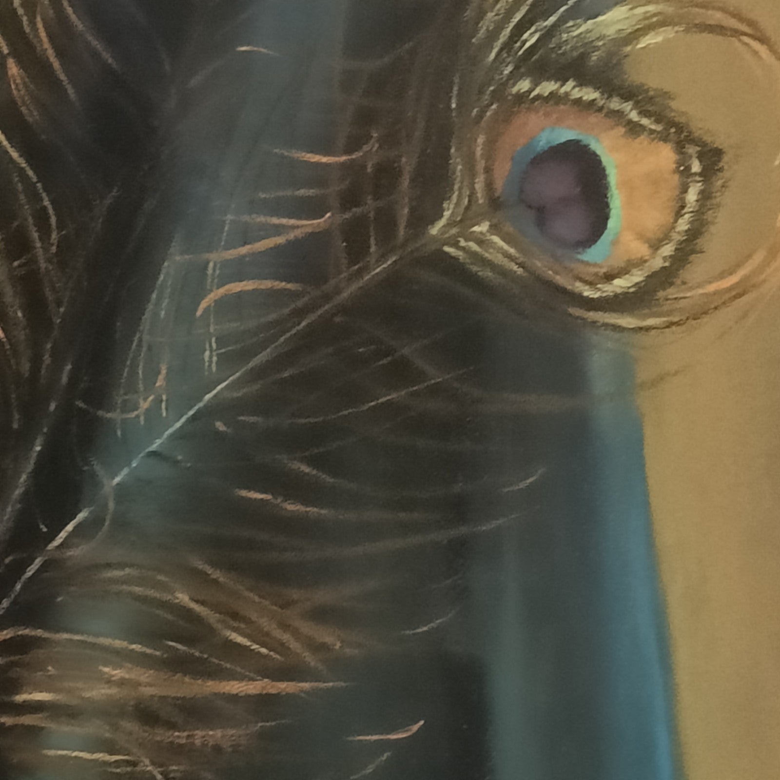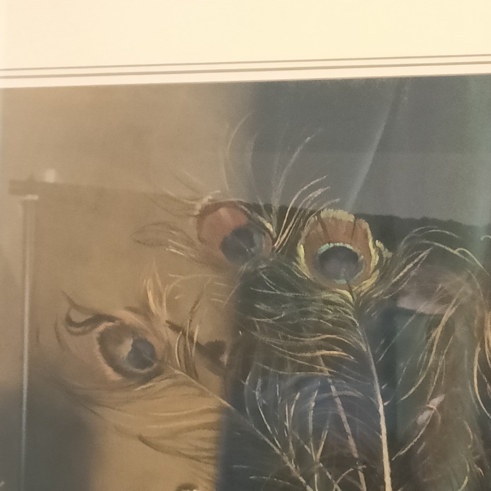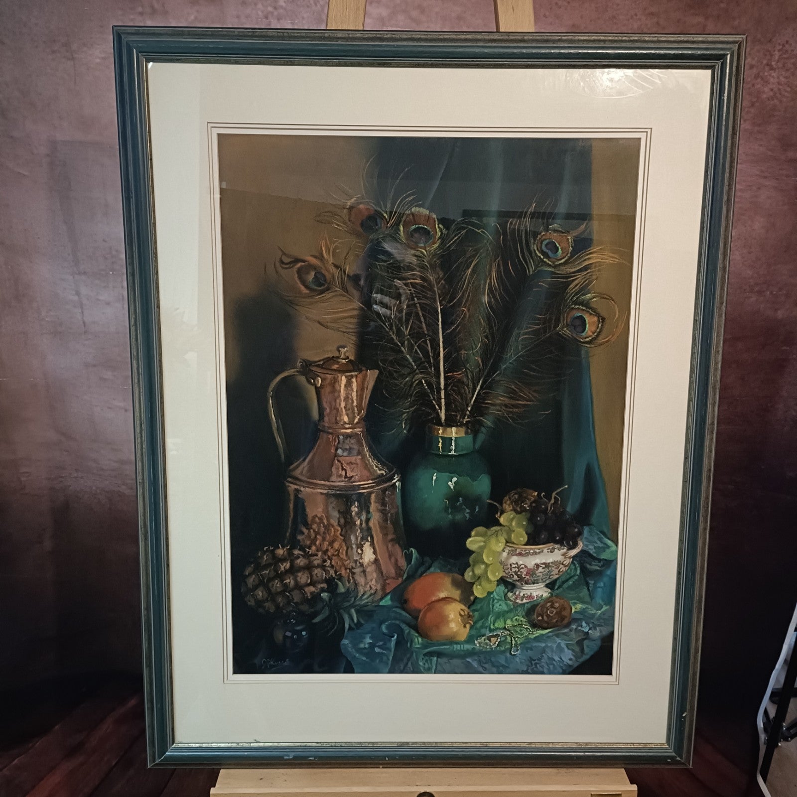 Stunning original still life pastel drawing by Christine G. Russell (b.1952), depicting a vase with peacock feathers, copper jug, pineapple, grapes, necklace, amazingly detailed.