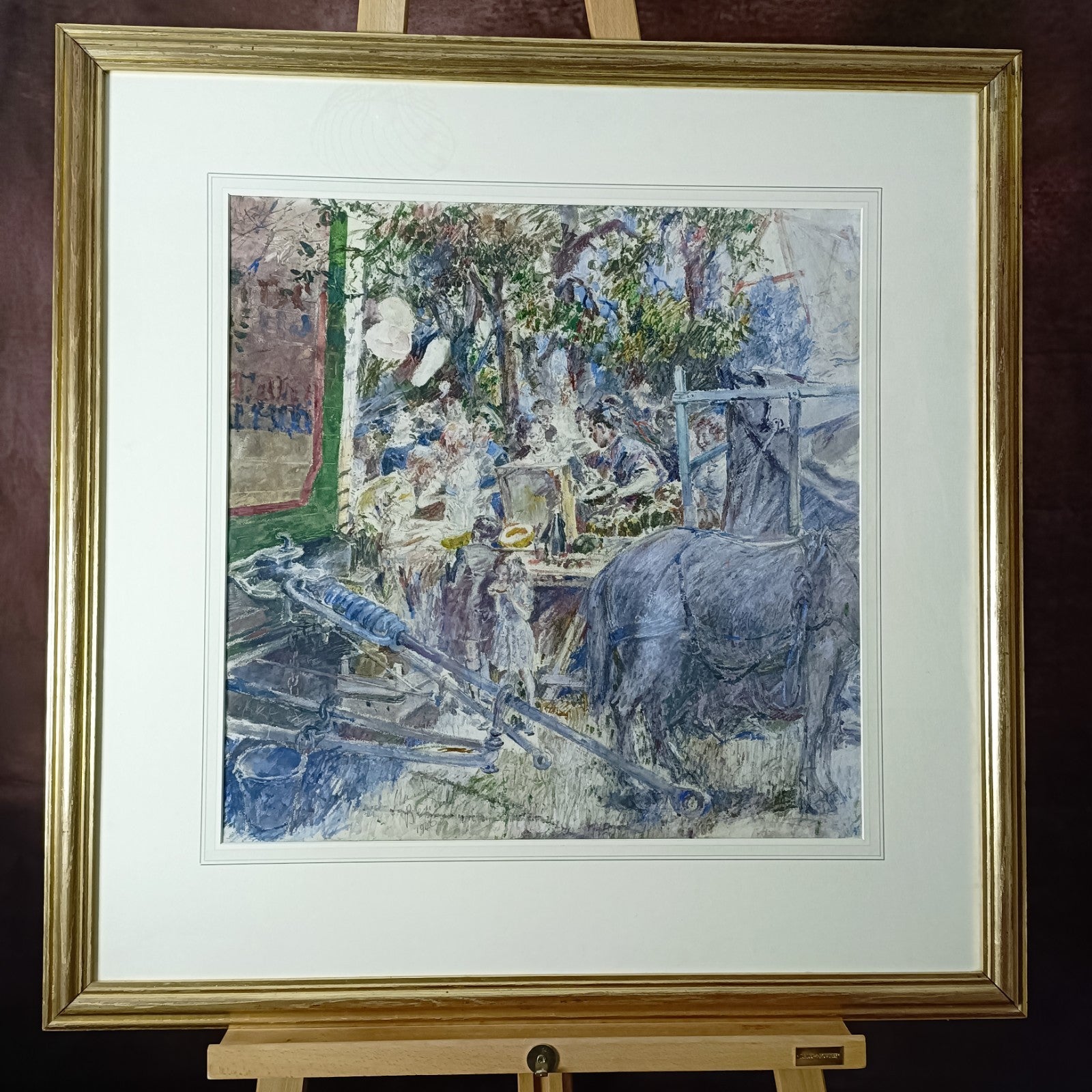 This large original signed gouache painting by Claude Bendall, titled "Fete Day", captures the essence of country shows, feasts, and equestrian activities. Created in 1946, the piece features a gathering of ponies, children, and infants, making it a unique and one-of-a-kind artwork from the mid-20th century. Mounted and framed, this unique painting showcases Bendall's talent in capturing the charm and spirit of rustic gatherings in the countryside. Measuring 59 cm in both height and width, this original artwork is a timeless addition to any art collection, reflecting a bygone era of simpler pleasures and rural festivities.