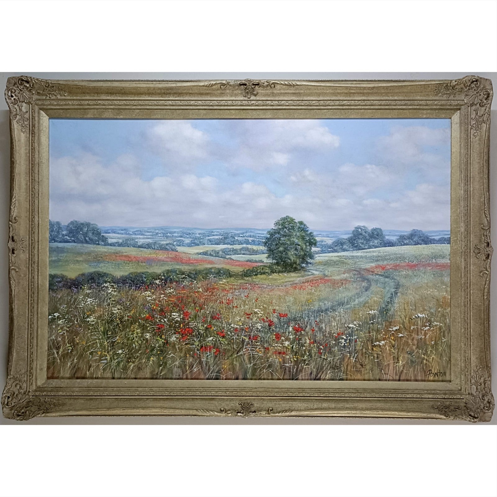 This beautiful countryside scene by Deborah Poynton captures the warmth and tranquillity of the English landscape in full bloom. A winding path leads through a field of vivid red poppies and soft white wildflowers, drawing the viewer gently toward a solitary tree beneath a softly clouded sky. Poynton’s delicate brushwork and harmonious palette create a sense of calm and openness, celebrating the quiet poetry of rural England. At 75cm × 50cm, this is a substantial and visually striking example of her work, offering both colour and serenity to any interior.