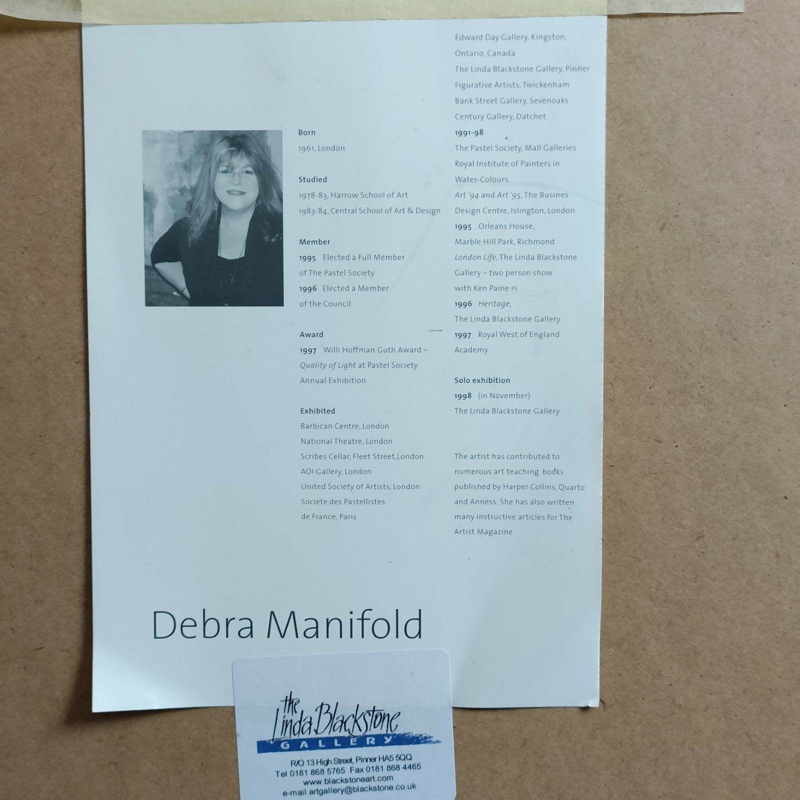 Debra Manifold (1961-2002) was a highly regarded British painter known for her powerful and original work. A post-graduate of Fine Arts and Printmaking, she quickly established herself as a sought-after artist. Her artistic talent was recognized by prestigious art societies in the UK, and she was a member of both the Pastel Society (PS) and the Royal Institute of Painters in Water Colours (RI). Manifold's diverse body of work included vibrant street scenes, café settings, and still life compositions, often executed in pastel or oil. She was also known for her engaging national magazine articles and courses, through which she shared her passion for art with others. Her significant contribution to the art world is further commemorated by the Debra Manifold RI Memorial Award, presented at the Royal Institute of Painters in Water Colours exhibitions.
