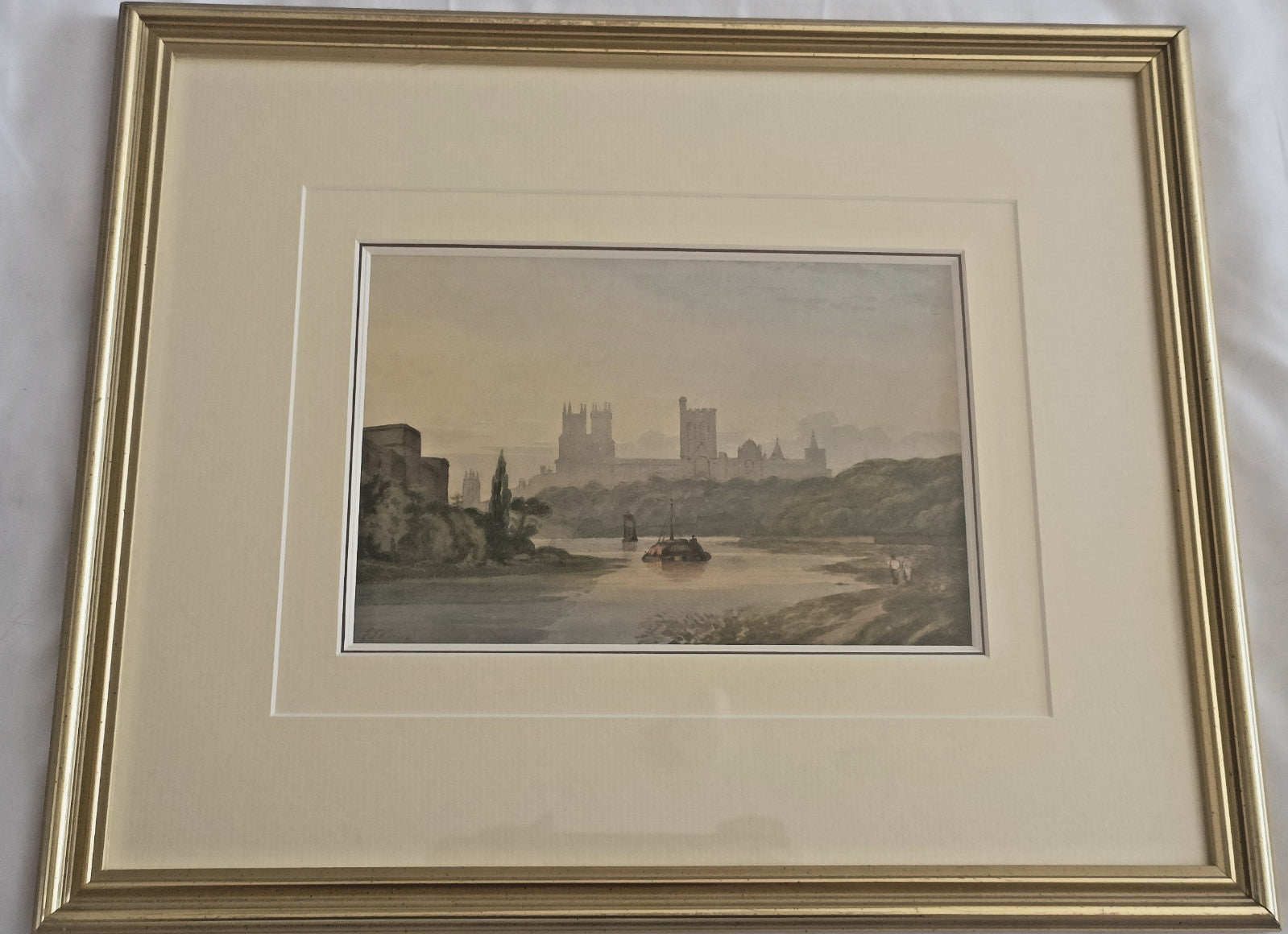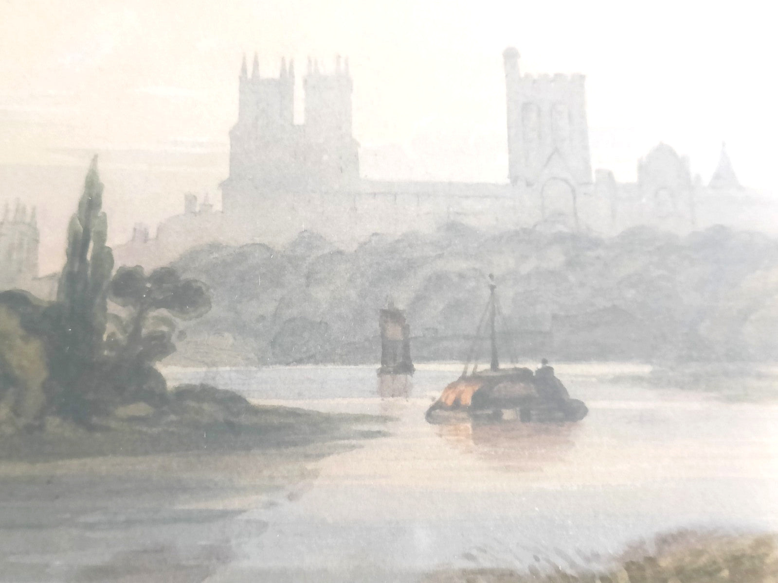Edgar John Varley's spectacular Watercolour of his grandfathers famous work currently in the British Museum - York Minster; River Ouse in foreground with city and smoke rising in distance, whole-length of minster against evening skyline, wood enclosed by wall to right
