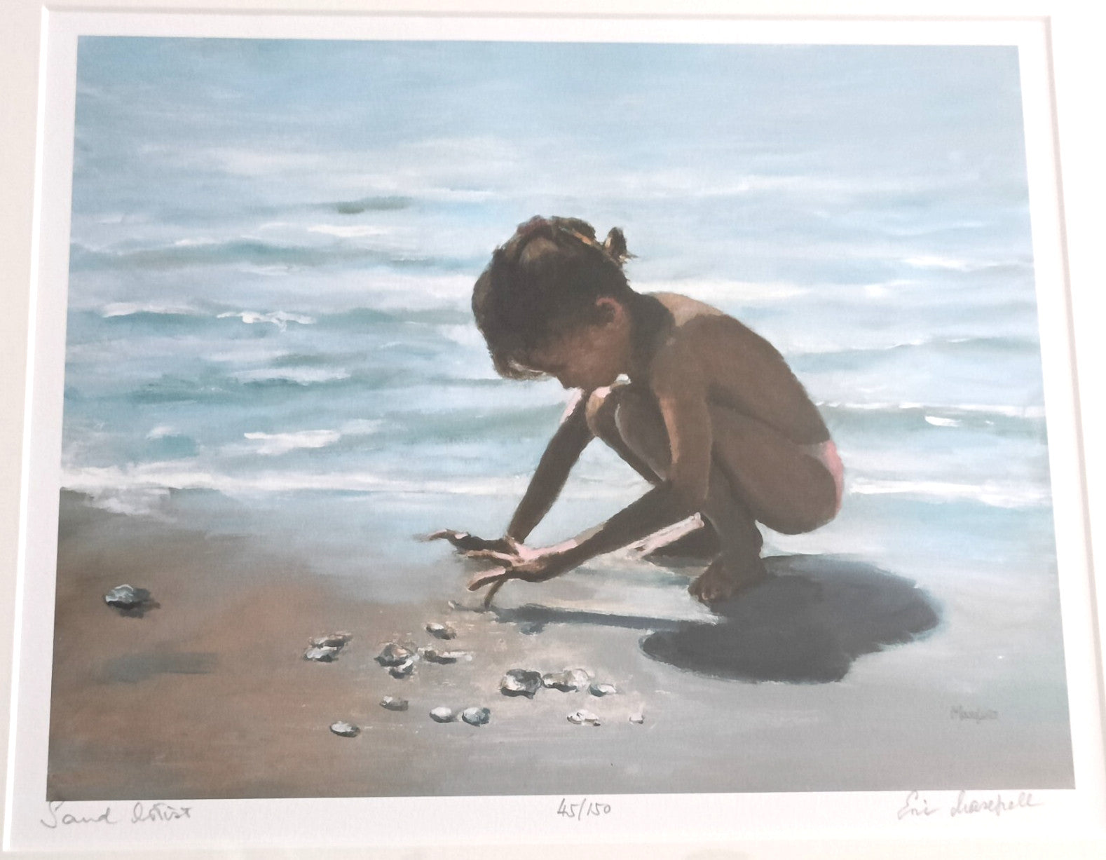 A Eric Masefield Limited Edition print 45/150 of the "Sand Artist", a nostalgic depiction of a child playing on a sandy beach.