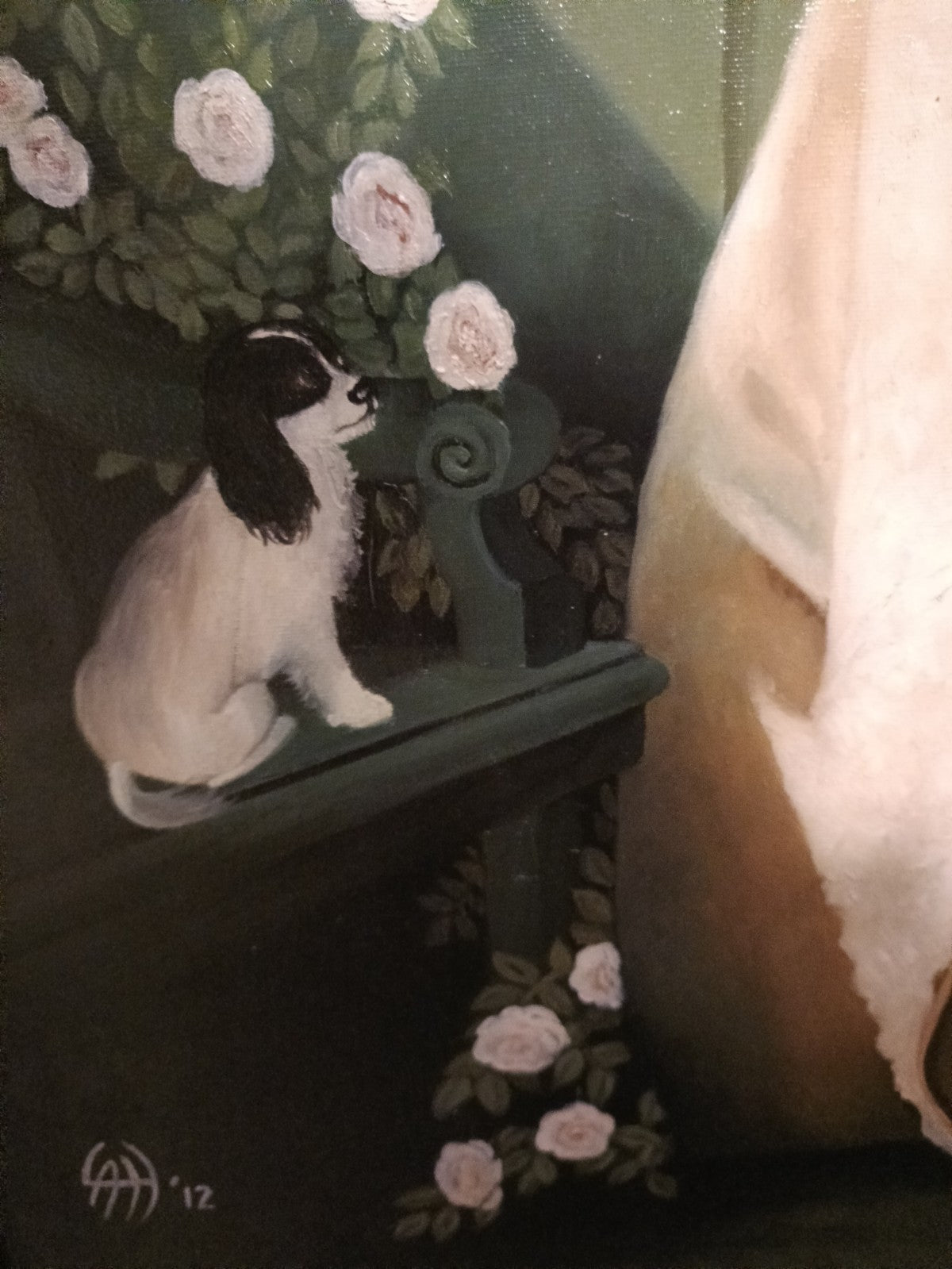 This elegant reproduction of François Boucher’s “Portrait of Madame de Pompadour” captures the refined charm and Rococo splendour of 18th-century French portraiture. Seated gracefully in a lush garden, the subject—Madame de Pompadour, famed patron of the arts and mistress to Louis XV—is depicted in an ornate gown adorned with ruffles and lace, extending a gentle hand toward a curious dog among blooming flowers. A verdant statue of a seated figure with cherub anchors the background, adding allegorical depth. Signed “LAH?” and dated ’12, this modern homage preserves the original’s romantic atmosphere while offering a fresh interpretation framed in gilded opulence.