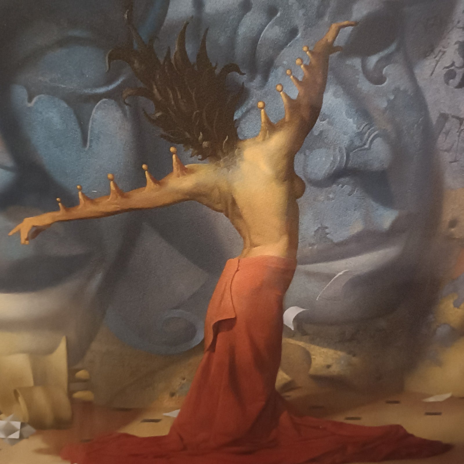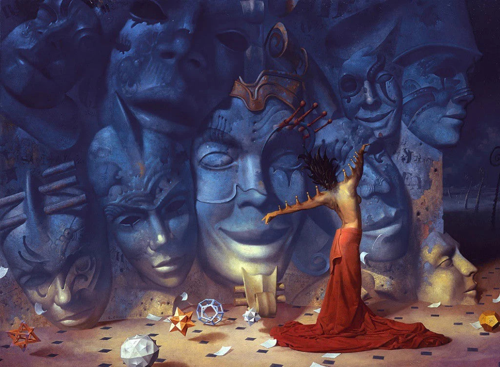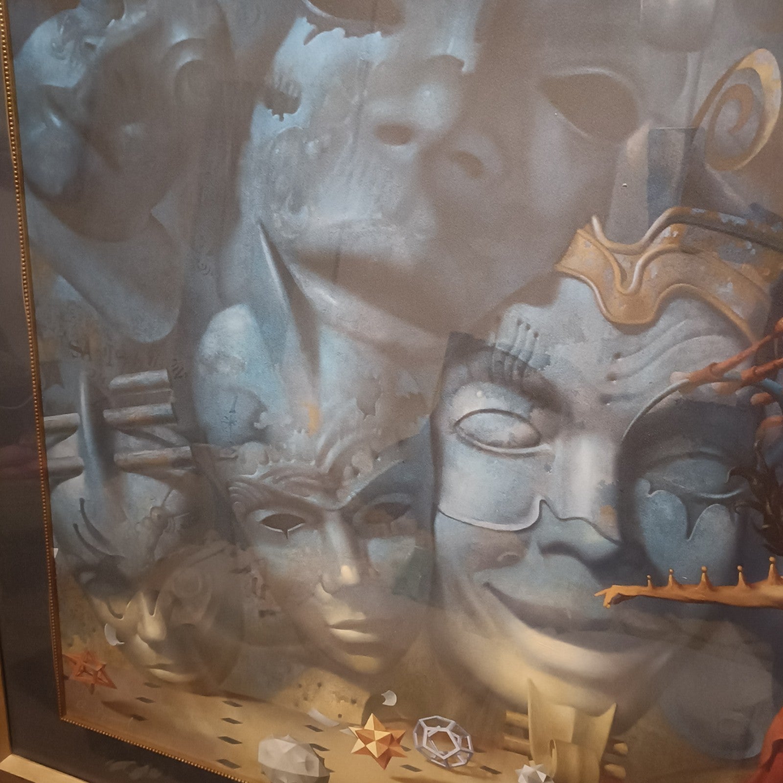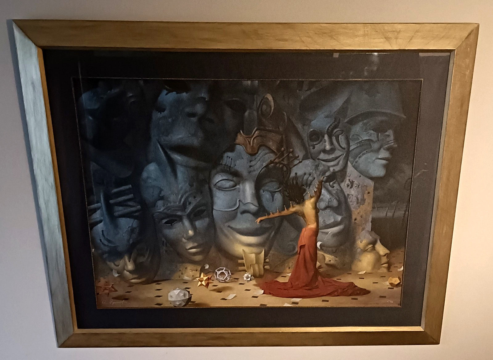 Remembrance is a hauntingly poetic meditation on memory, identity, and the ephemeral nature of human existence. In this limited edition giclée print, a solitary figure stands draped in flowing red cloth, back turned and arms outstretched toward a looming wall of expressive masks—each one a fragment of emotion, persona, or forgotten self. The figure’s exaggerated spine, pierced with metallic rods, evokes both vulnerability and resilience, suggesting the weight of lived experience and the scaffolding of memory. Scattered geometric forms and polyhedra on the floor—symbols of rationality and permanence—contrast with the swirling, dreamlike background, where faint architectural echoes dissolve into shadow. The chequered pattern beneath the figure hints at duality and theatricality, reinforcing the sense of life as a staged interplay of roles and recollections. Bruvel’s surrealist language invites viewers to reflect on what remains when the self is stripped bare: the echoes of feeling, the masks we wear, and the enduring “song of life” that lingers in the silence of remembrance.