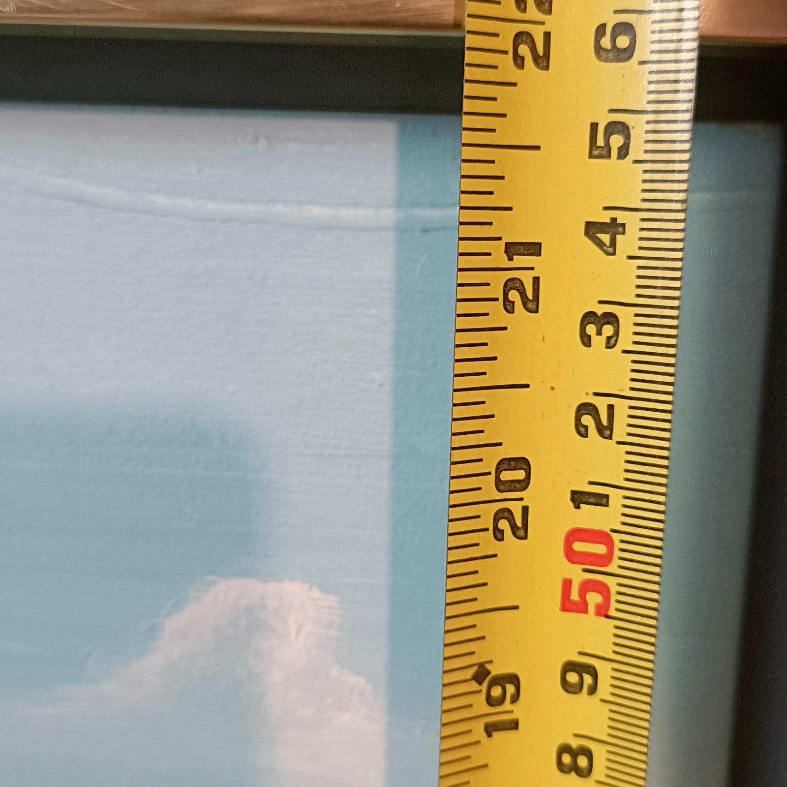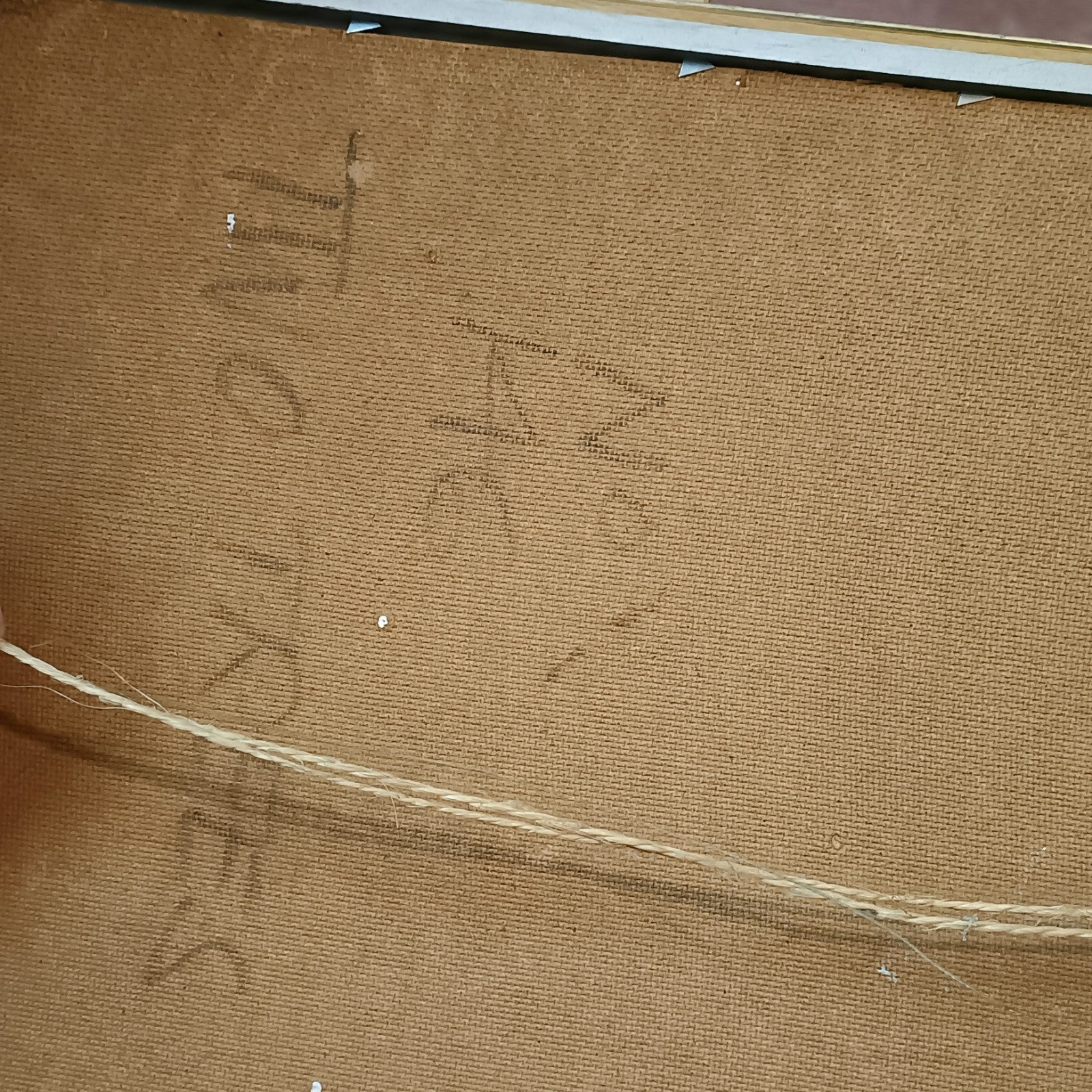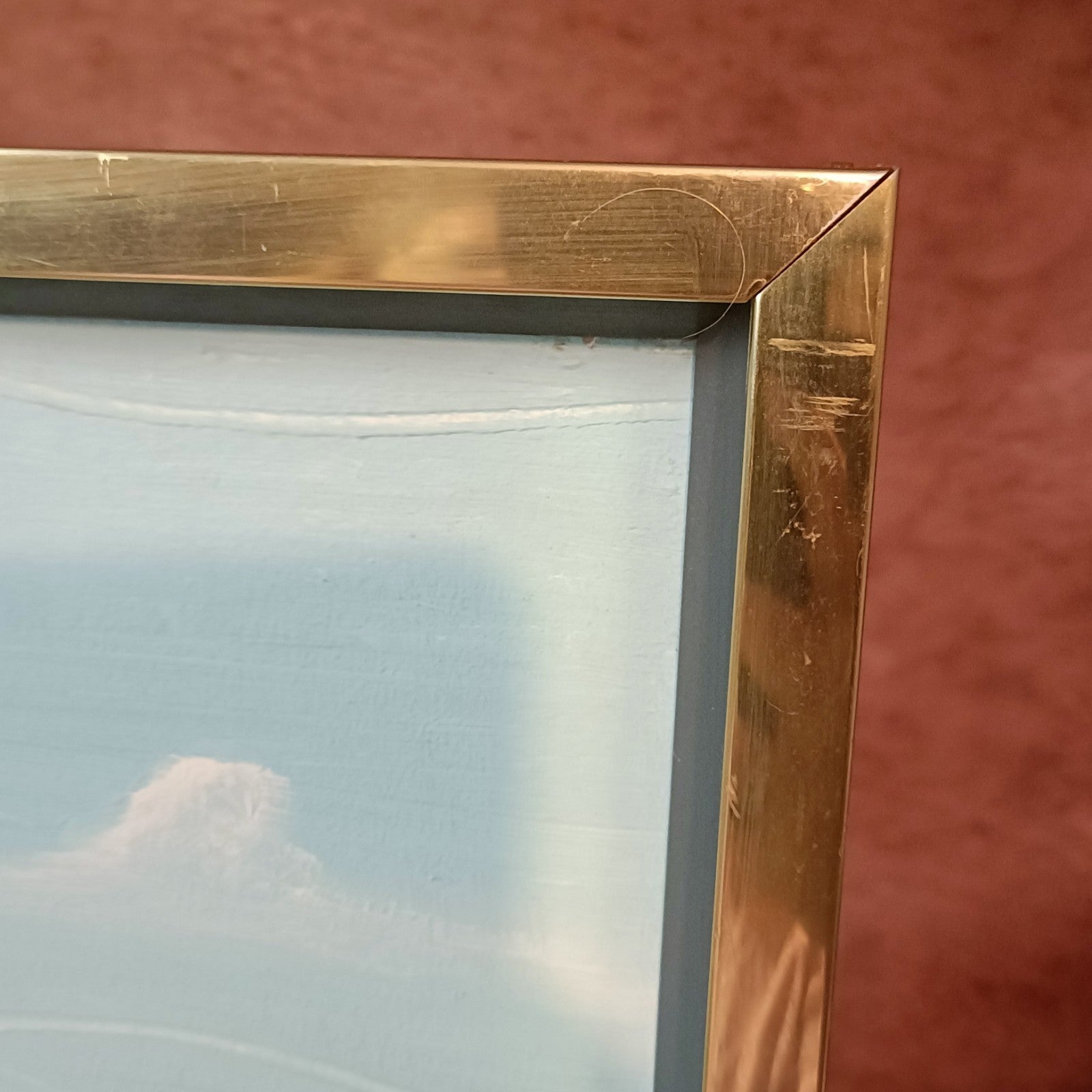 The product is an original oil painting on board by artist Lewis Mitchell, created in the 1970s. Titled "Two Trees", this medium-sized artwork features a landscape with fields, trees, grass, and greenery. The naïve art style and unique one of a kind (OOAK) piece is framed and measures 56cm in height and 62cm in width. Lewis Mitchell's distinctive oil paint and Sgraffito technique bring a charming and rustic feel to this authentic and vintage artwork.