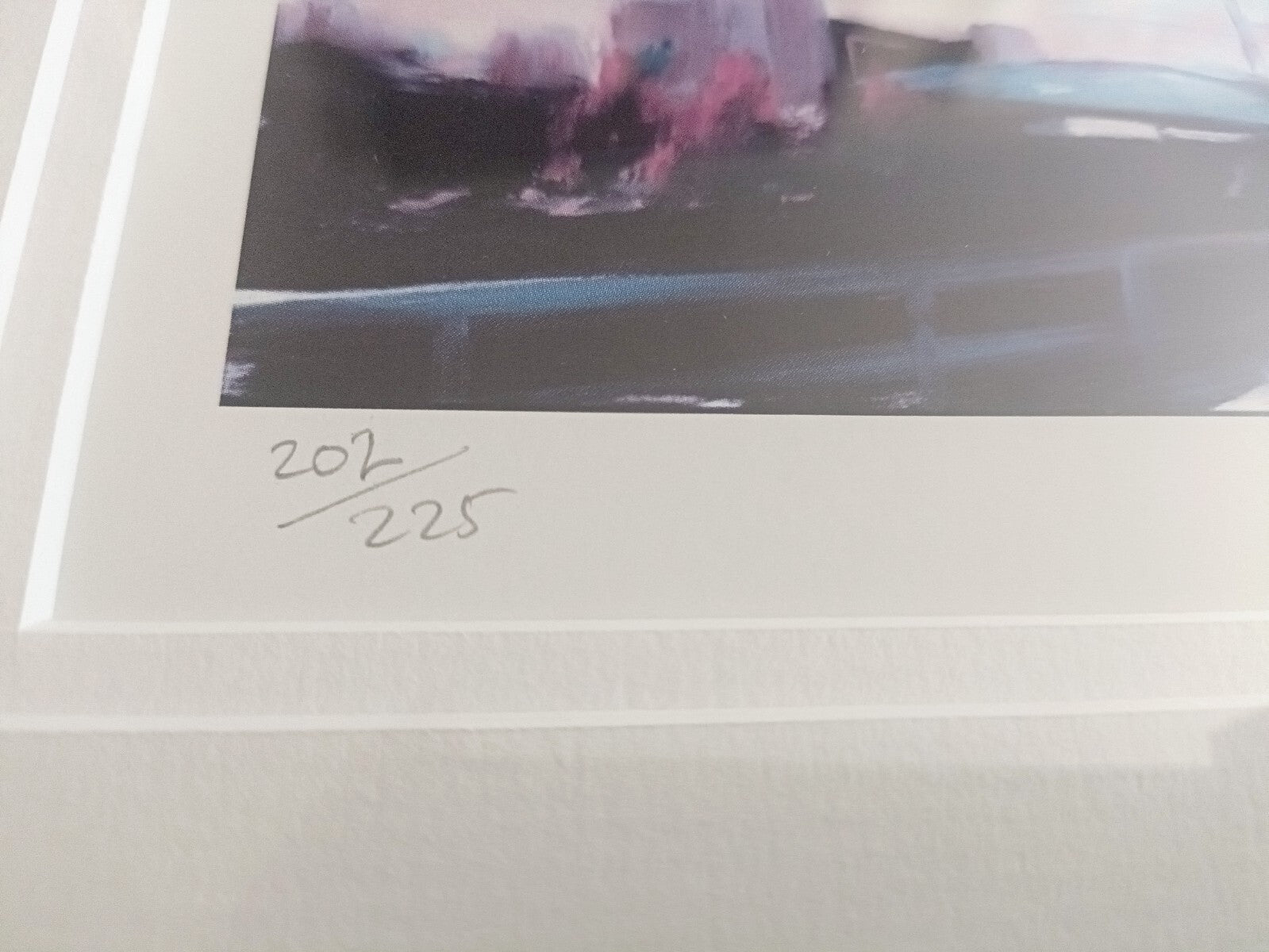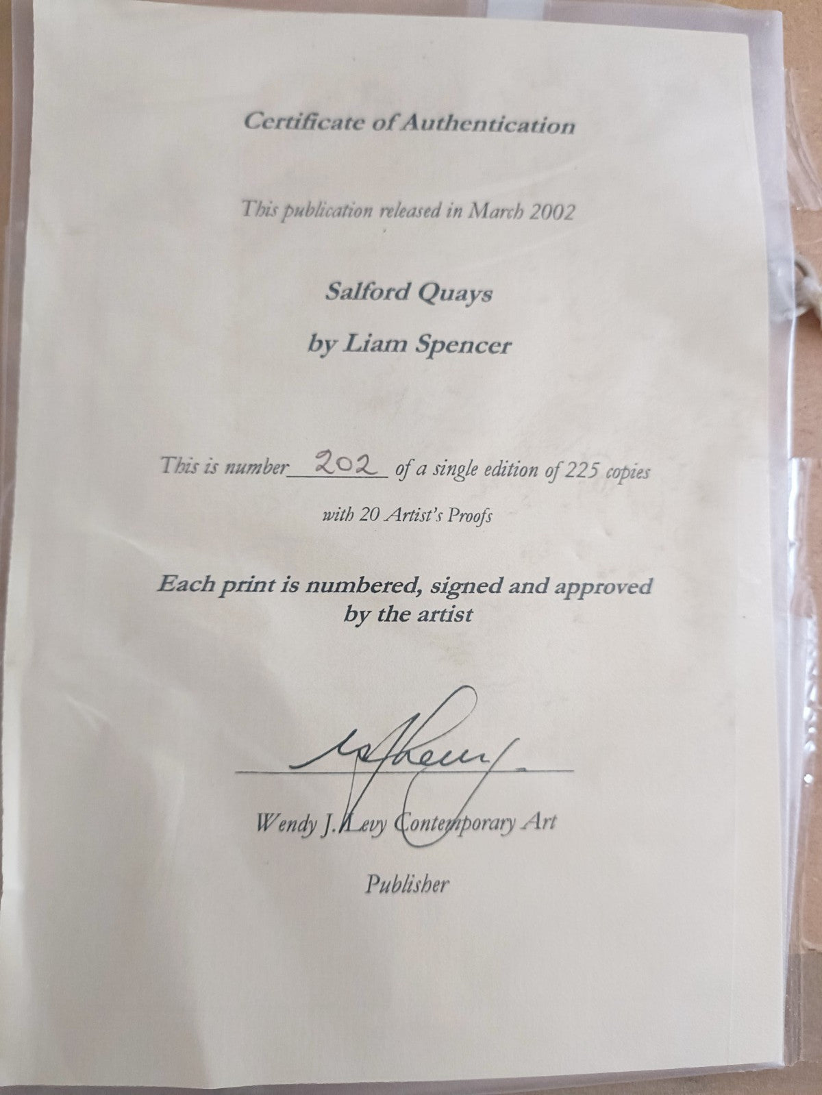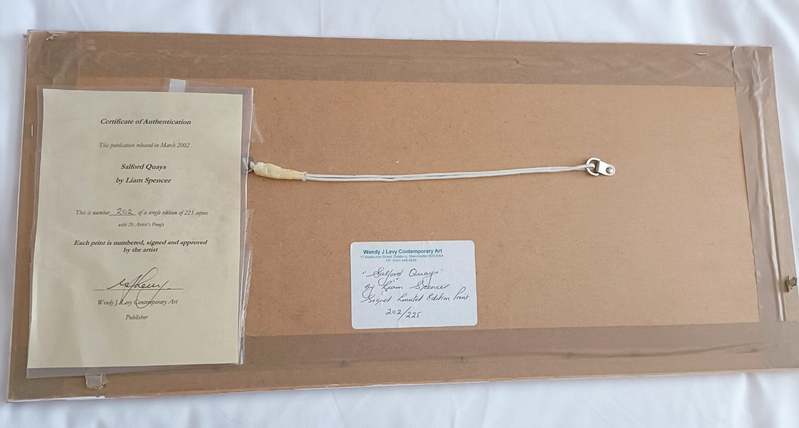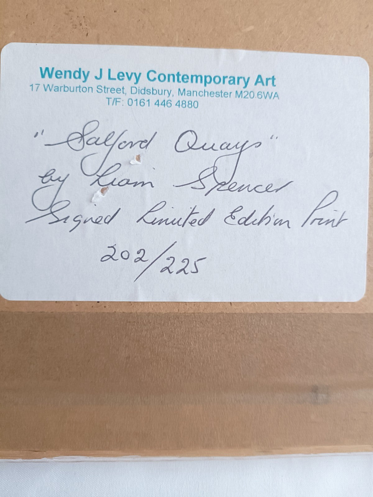 The product is a signed limited edition giclée print by artist Liam Spencer, featuring a landscape orientation of Salford Quays in Manchester. This framed artwork is numbered 202 out of 225 and comes with a Certificate of Authenticity issued by Wendy J Levy. The print showcases the cityscape of Salford Quays, making it a unique and collectible piece for art enthusiasts.