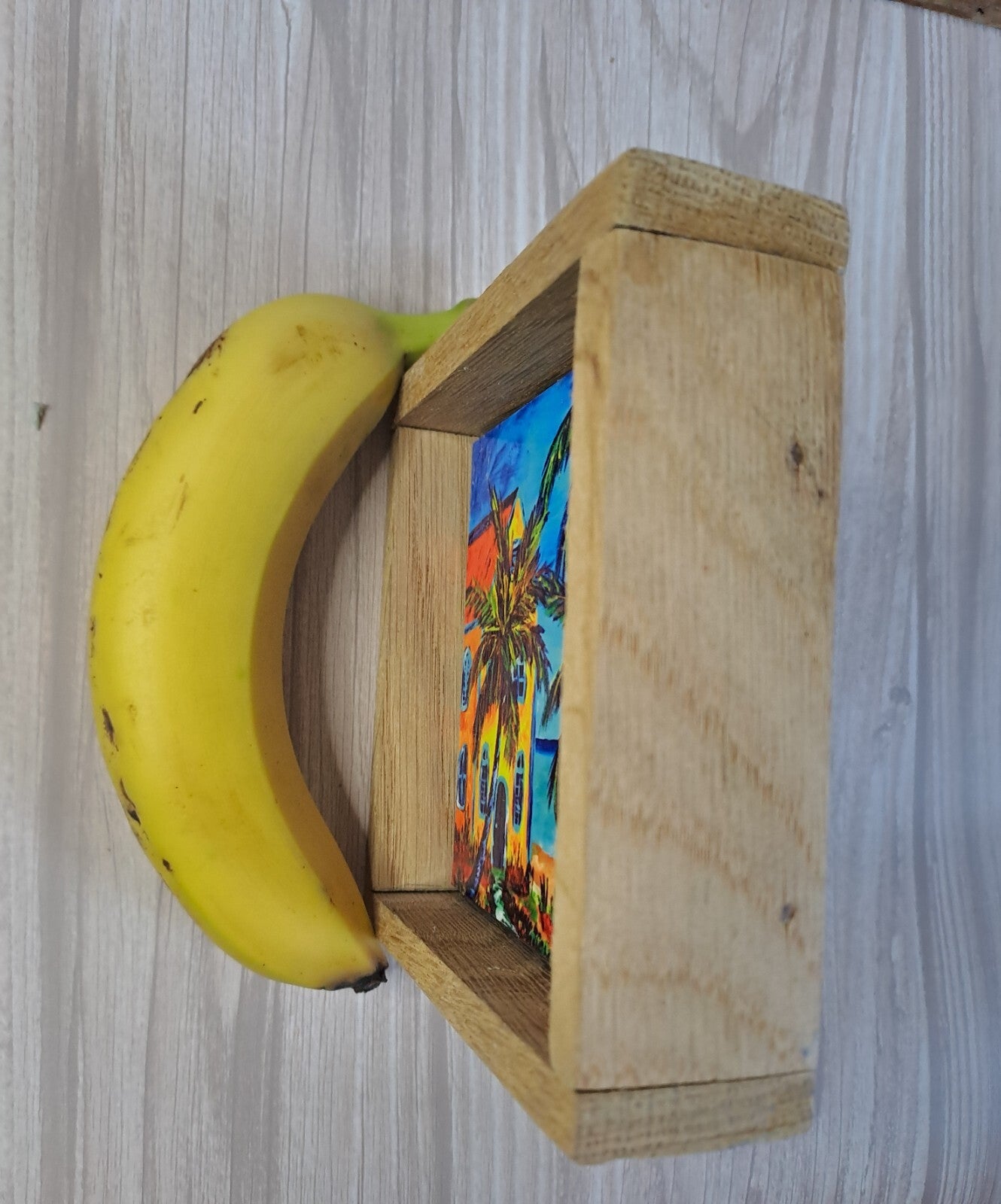 Very good condition. Tile and colours still "pop" Frame has the expected patina of wood being in the sea for 5 lobster seasons!