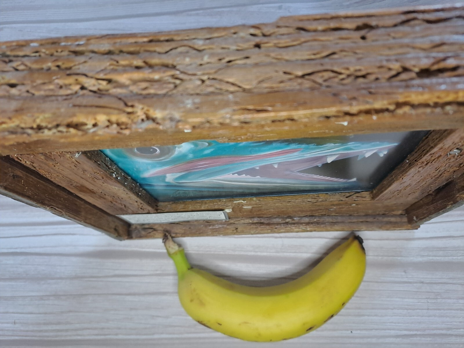 Printed tiles from original work by Nadine and Glenn Lahti. Tile mounted into a one of a kind lobster trap frame
