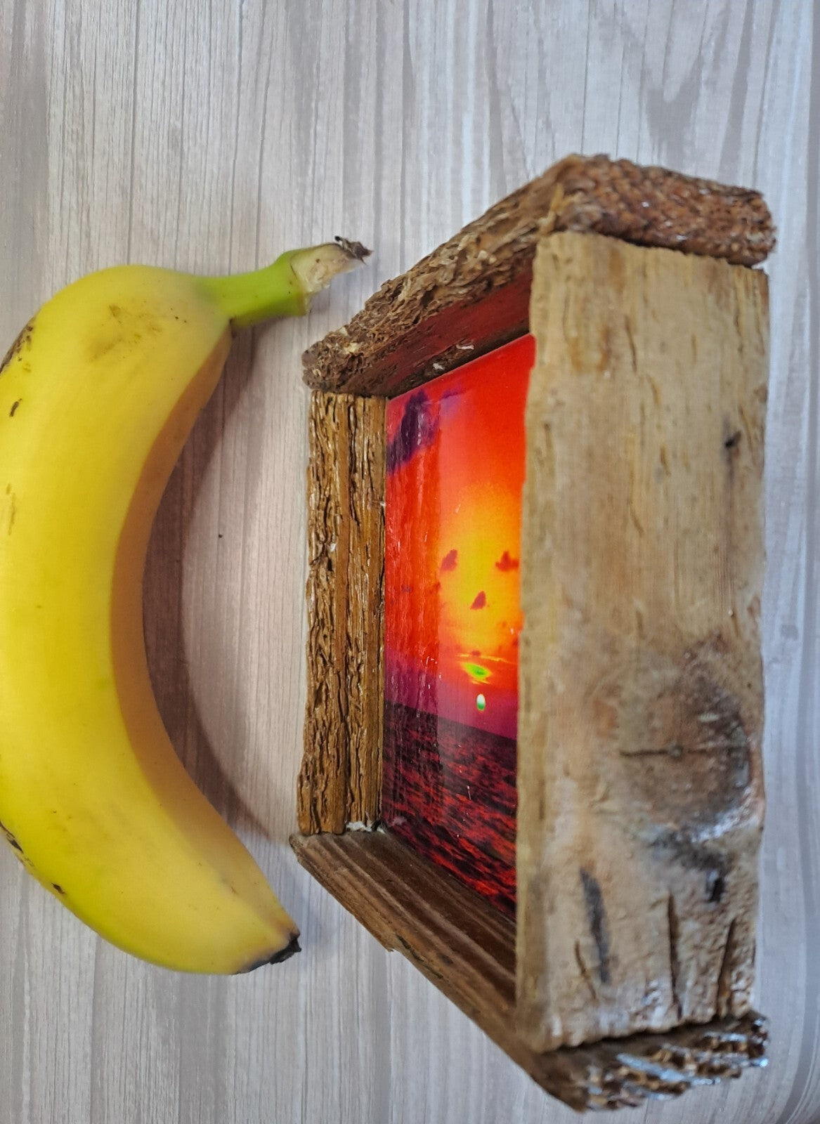 Printed tiles from photograph taken by Nadine and Glenn Lahti. Tile mounted into a one of a kind lobster trap frame