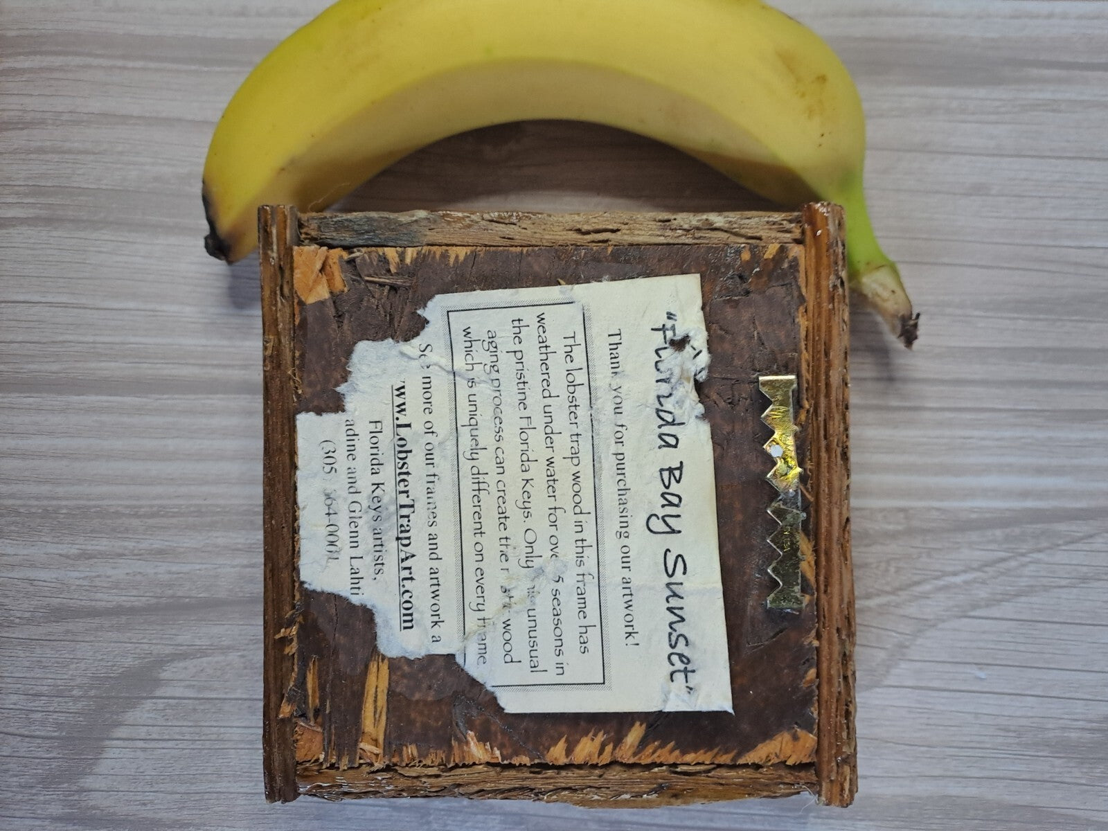 Fair condition. White dots in the photographs are small scratches. Colours still "pop" Frame has the expected patina of wood being in the sea for 5 lobster seasons!