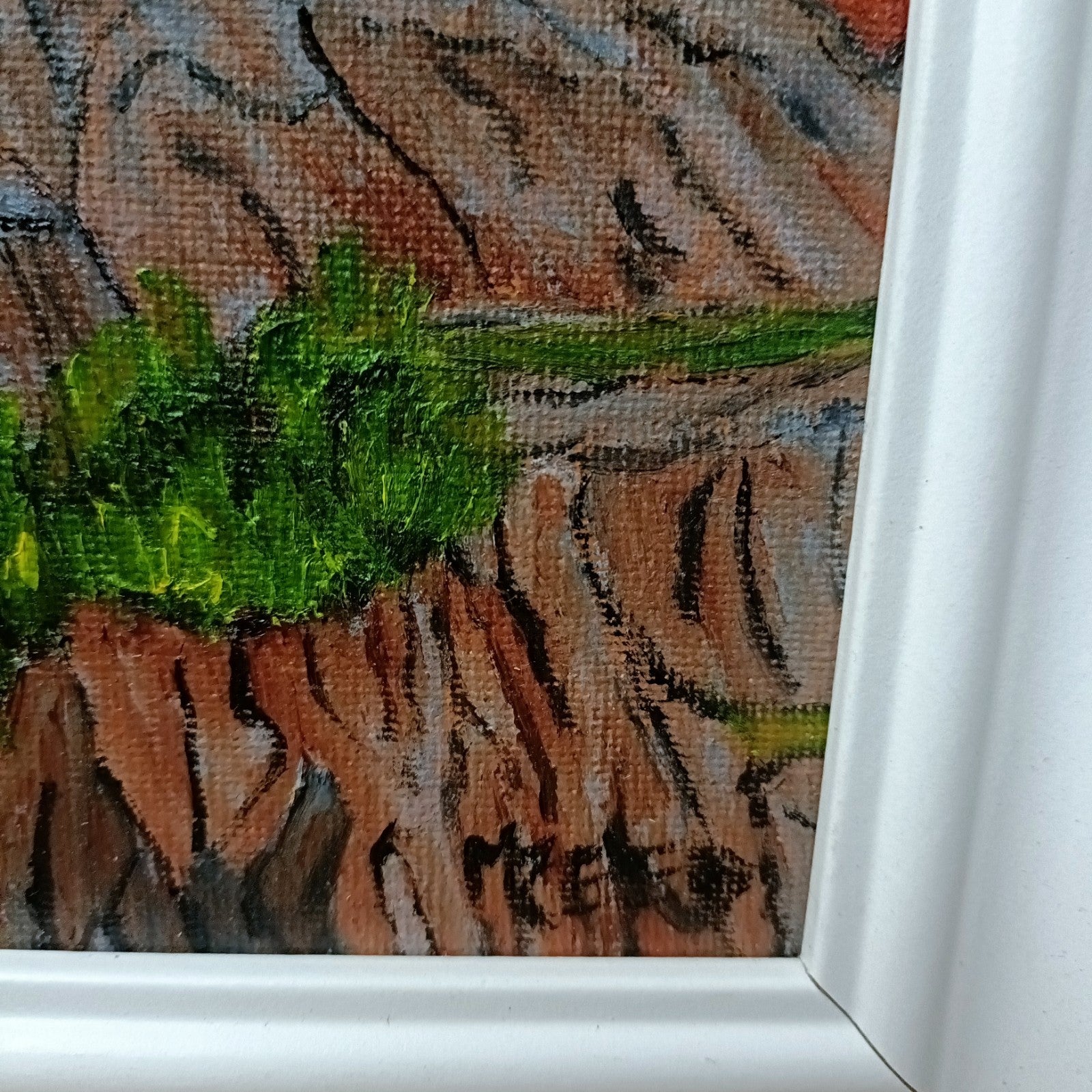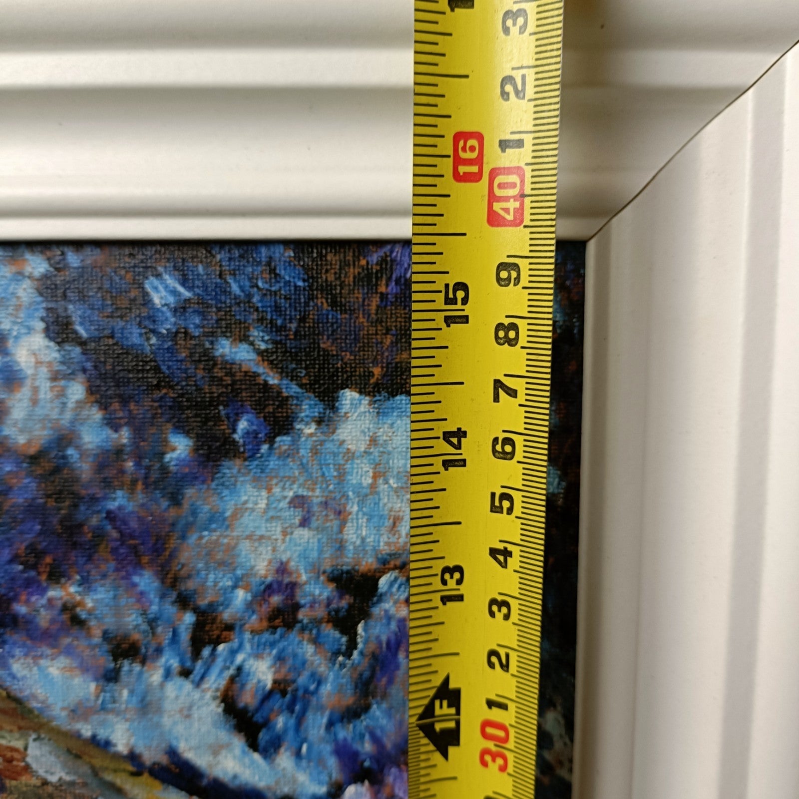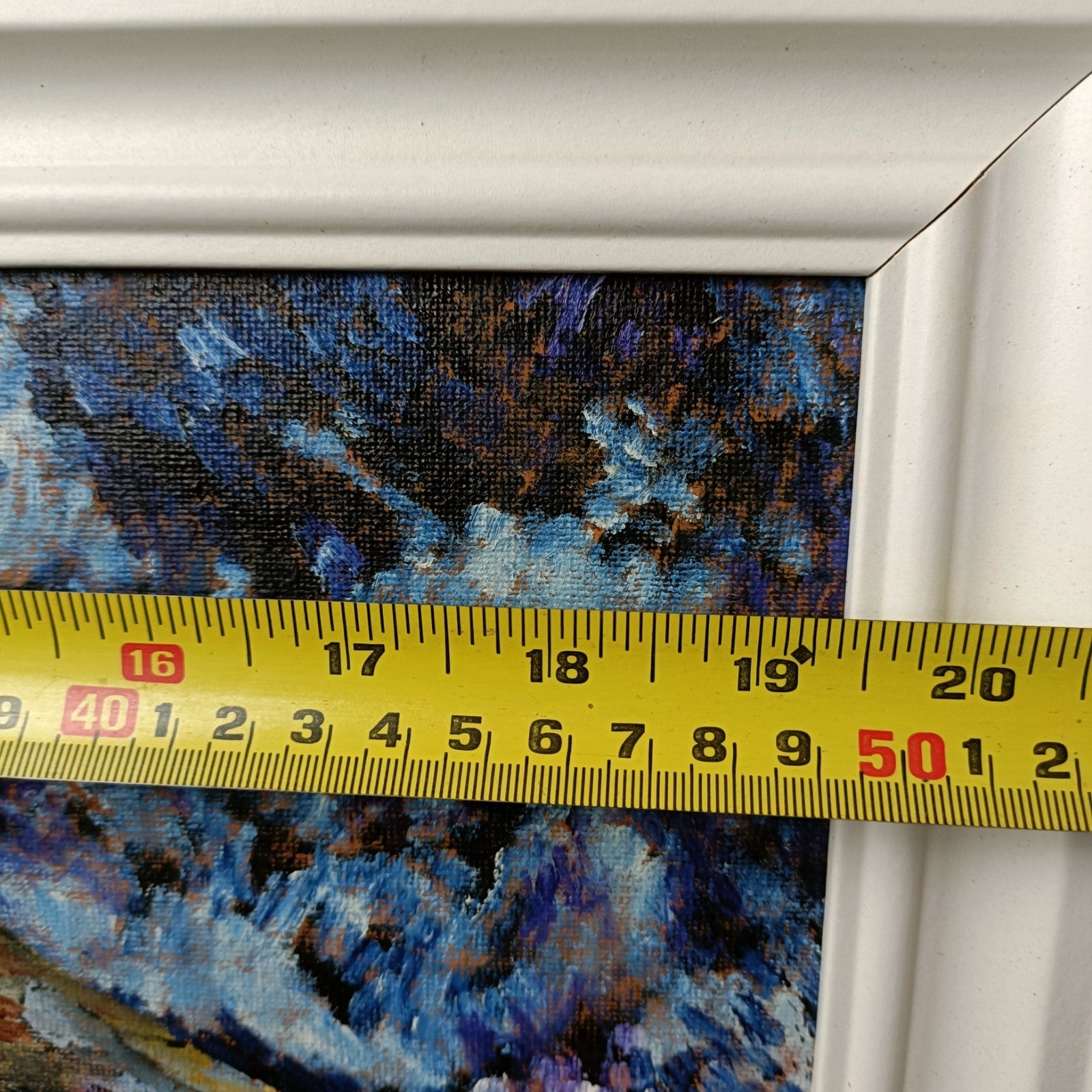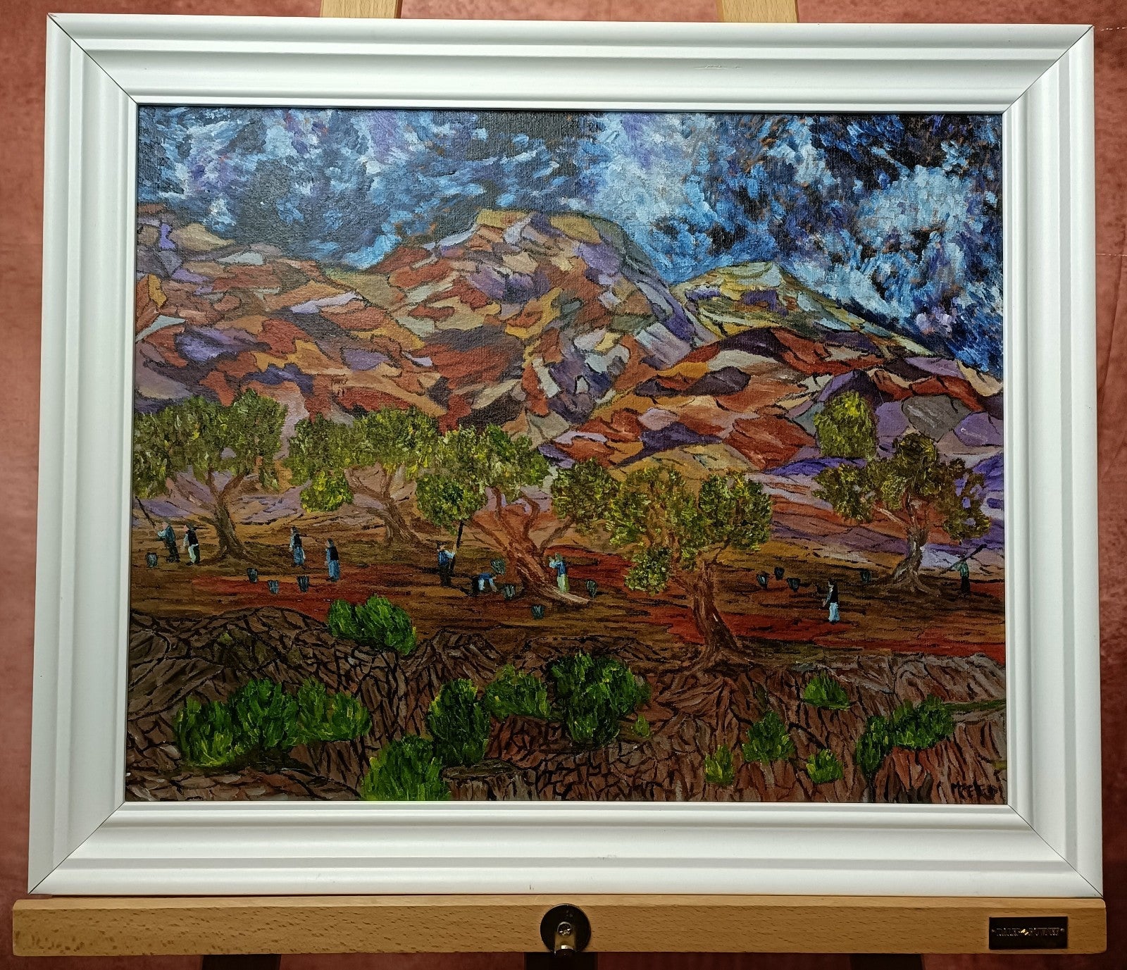 “The Olive Harvest” by Mark Reed (b.1955) is a vivid celebration of rural life, rendered in Reed’s signature expressive style. The composition pulses with energy as figures move among olive trees, engaged in the timeless ritual of harvest. Rolling hills rise behind them in a kaleidoscope of reds, purples, and ochres, their patchwork surfaces echoing the rhythms of the land. Above, a swirling sky of deep blues and whites adds drama and emotional weight, suggesting nature’s grandeur and unpredictability. Reed’s brushwork is bold and textured, emphasizing movement and mood over realism, and inviting viewers into a landscape that feels both ancient and alive.”
