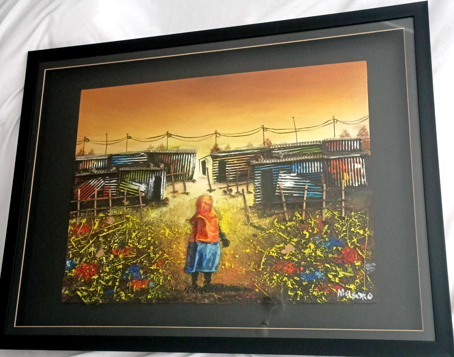 Vibrant 3D artwork from South African artist Masoko depicting a female figure before a village of corrugated houses, signed Masoko bottom right.