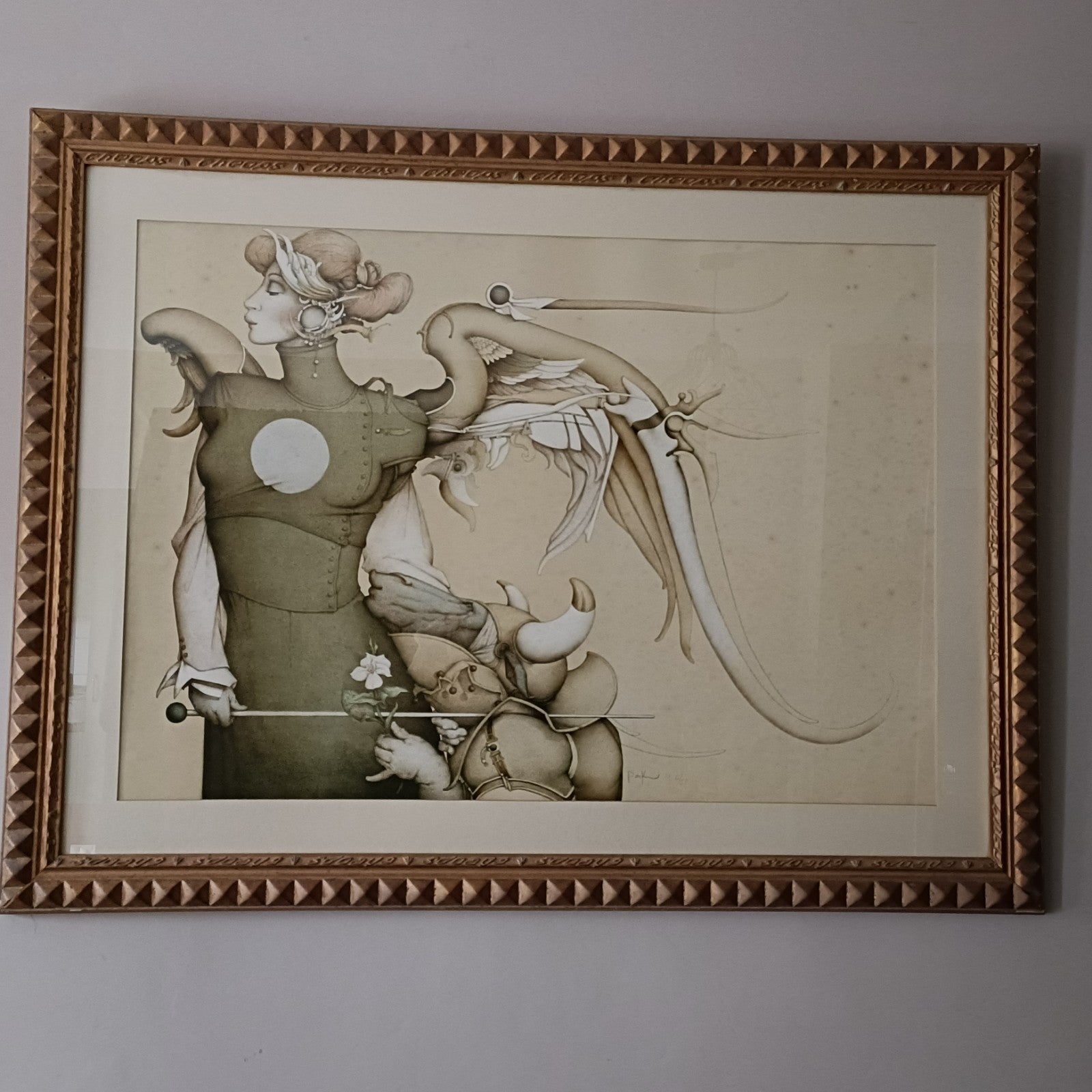 In “Surrender to the Light,” Michael Parkes conjures a moment of transcendence through his signature blend of magical realism and classical draftsmanship. A luminous female figure, poised in mid-air with angelic wings unfurled, drifts toward a radiant source beyond the frame — her posture serene, her gaze inward. Accompanied by a whimsical armoured creature, she embodies both vulnerability and strength, as if shedding earthly burdens in favour of spiritual clarity. Parkes’ mastery of stone lithography is evident in the soft gradations of light and shadow, which evoke a dreamlike stillness. The composition invites viewers to contemplate surrender not as defeat, but as awakening — a passage into grace.