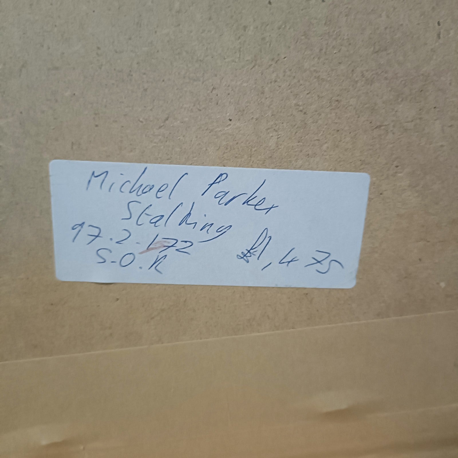 The product is a large portrait print by artist Michael Parkes titled "Stalking", created in 1988 using stone lithography. This artist proof, fingerprinted, and signed print is numbered 4/25, making it a rare and valuable collectible piece. The surrealistic artwork features themes of mysticism, symbolism, and fantasy, with a captivating image of a hunter and female figure depicted in a surreal and mystical setting. The framed print measures 77cm in height and 56cm in width, showcasing the unique and magical style of Michael Parkes' artwork from the 1980s.