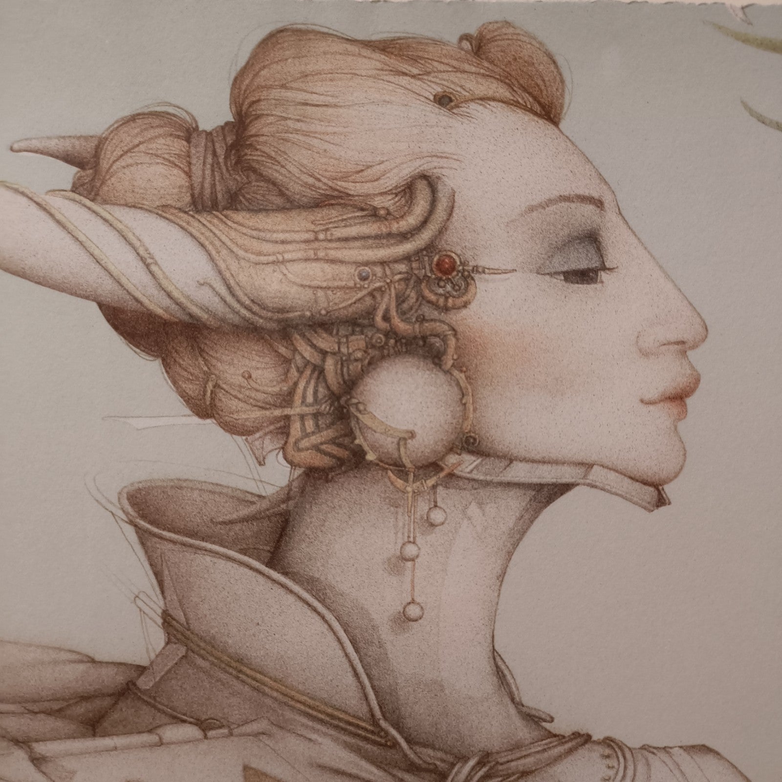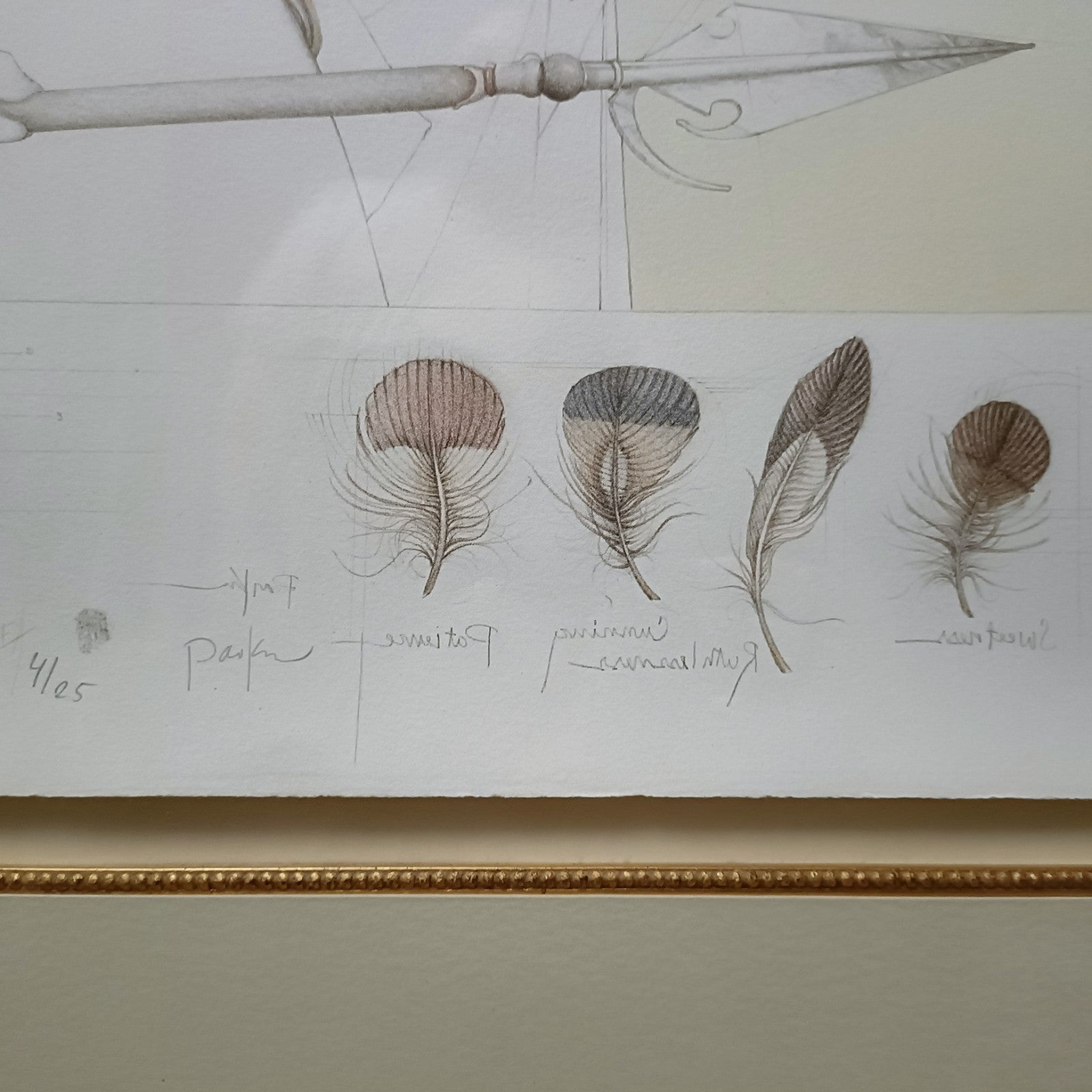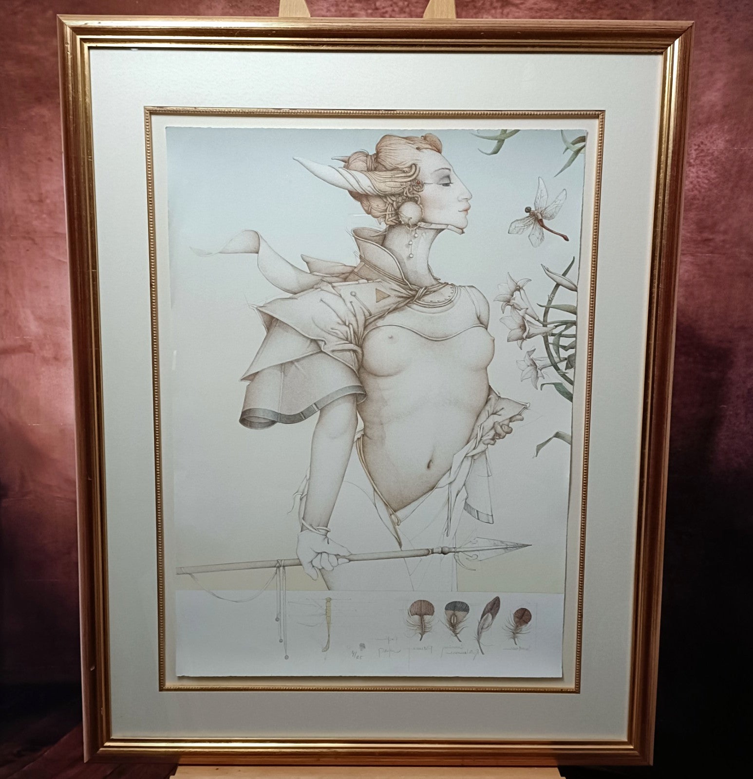Artist proof 4/25 "Stalking" A stone lithograph featuring a poised, elegant, and powerful female figure holding a spear. This work is characteristic of Parkes's style, which often combines a meticulous, realistic drawing technique with fantastical and mystical subject matter creating dreamlike scenes with elements from mythology and various esoteric traditions.