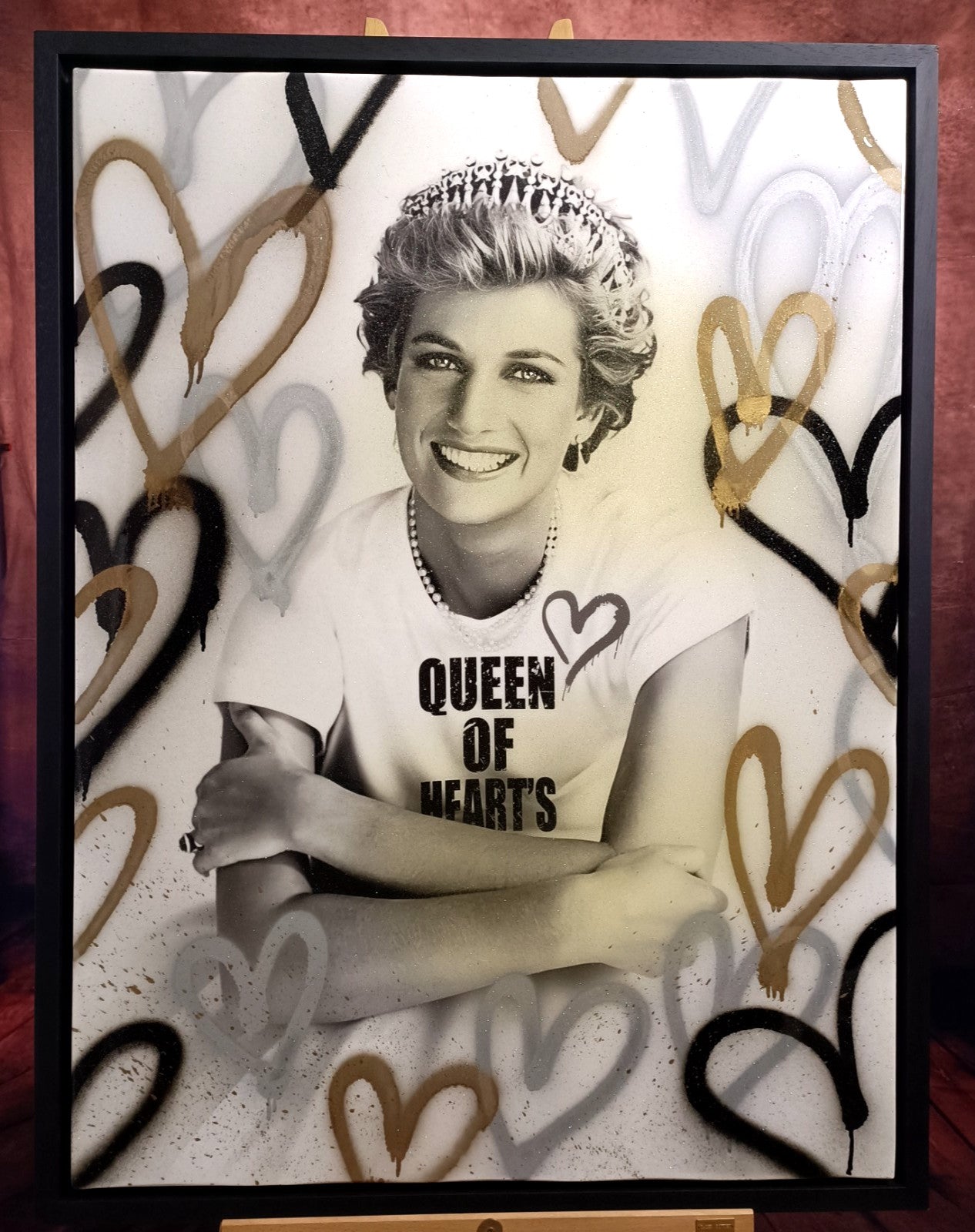 This large original mixed media painting by artist Mr Sly features a unique portrait of Princess Diana as the Queen of Hearts. The artwork showcases a royal and glittery theme, with elements of love, sparkle, hearts, and diamonds. Framed and measuring 126 cm in height and 95 cm in width, this one-of-a-kind piece is a stunning representation of urban and pop art styles. A truly captivating and eye-catching addition to any art collection.