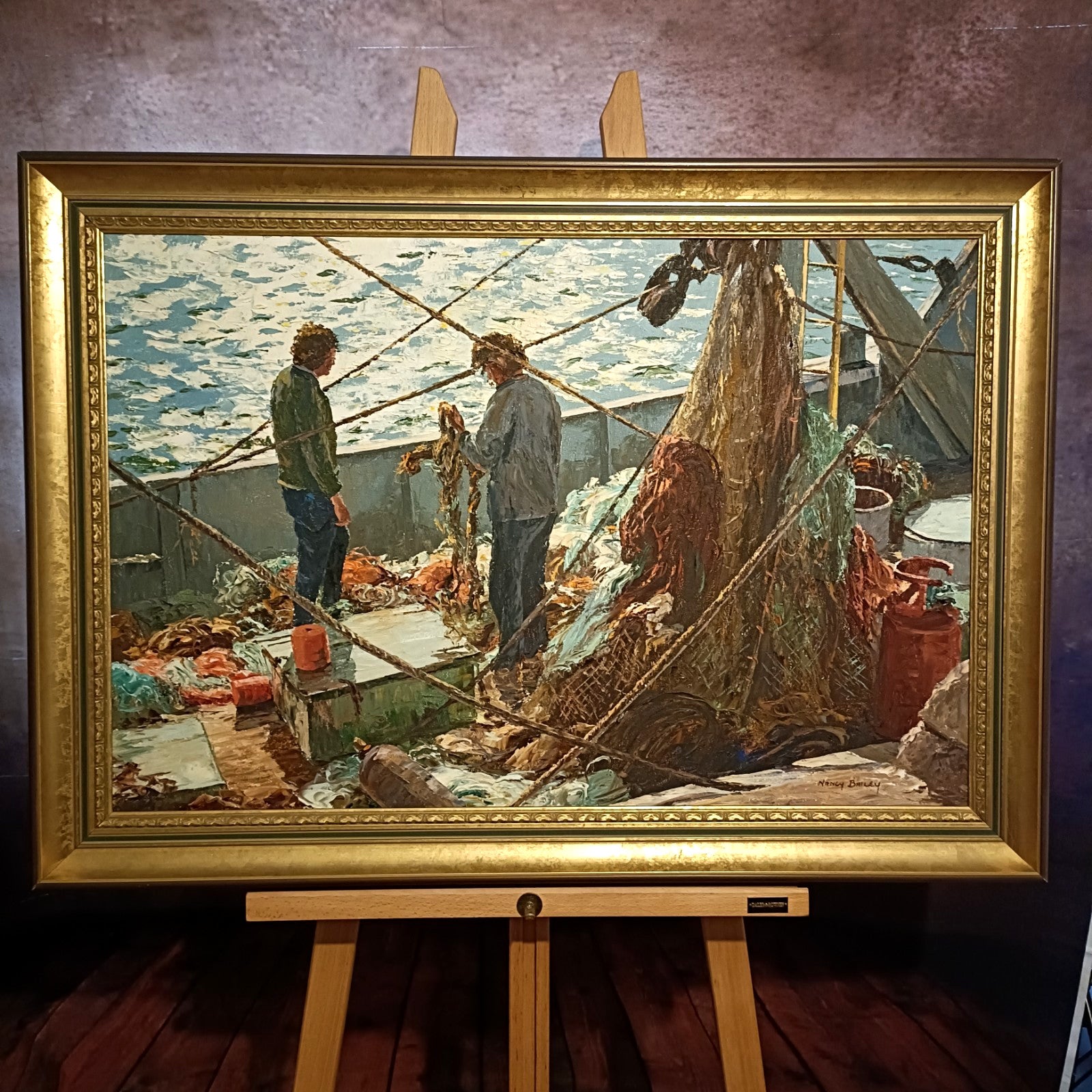 Nancy Bailey’s evocative maritime scene "Ropes & Things" captures the quiet resilience of coastal labour. Two figures stand on the deck of a fishing vessel, immersed in the rhythm of their work as ropes and nets crisscross the composition. The textured palette knife technique—Bailey’s signature—imbues the surface with a tactile energy, echoing the grit and motion of life at sea. Rich blues and earthy tones evoke the salt-worn atmosphere of the harbour, while the scattered gear and layered rigging lend authenticity and depth. Signed lower right, this work exemplifies Bailey’s commitment to portraying the dignity of working lives along Britain’s rugged coast.