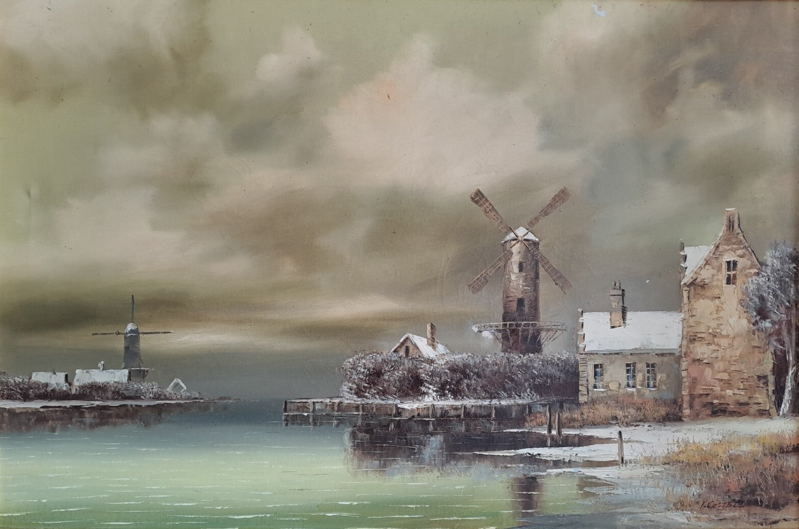 Beautiful original oil painting on canvas of a serene windmill landscape with dutch influence signed I. Costello