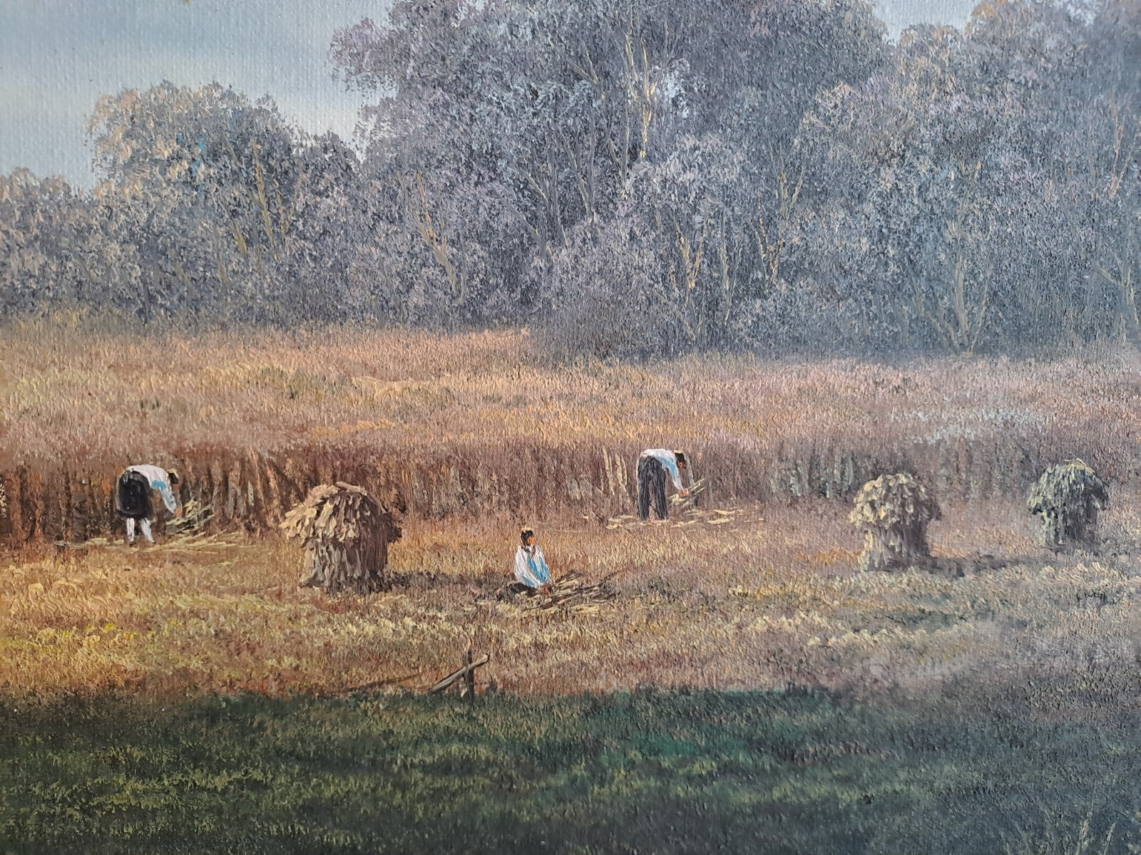 P WILSON Large Vintage Oil Embellished Print "Study of Harvesters"