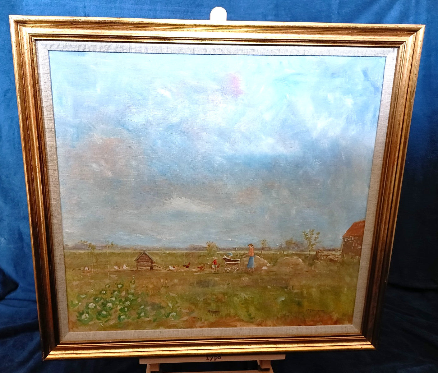 This original oil painting by Peter Jamieson depicts a charming scene of "Dr Humphrey and Monty going to feed the chickens". The medium-sized painting on board is framed and signed by the artist, making it a unique and one-of-a-kind piece. The landscape, family, and farming theme is beautifully captured in this delightful artwork, which measures 66cm in height and 61cm in width. It is a special addition to any art collection, showcasing the artist's talent in capturing domestic and family life with a touch of whimsy and nostalgia.
