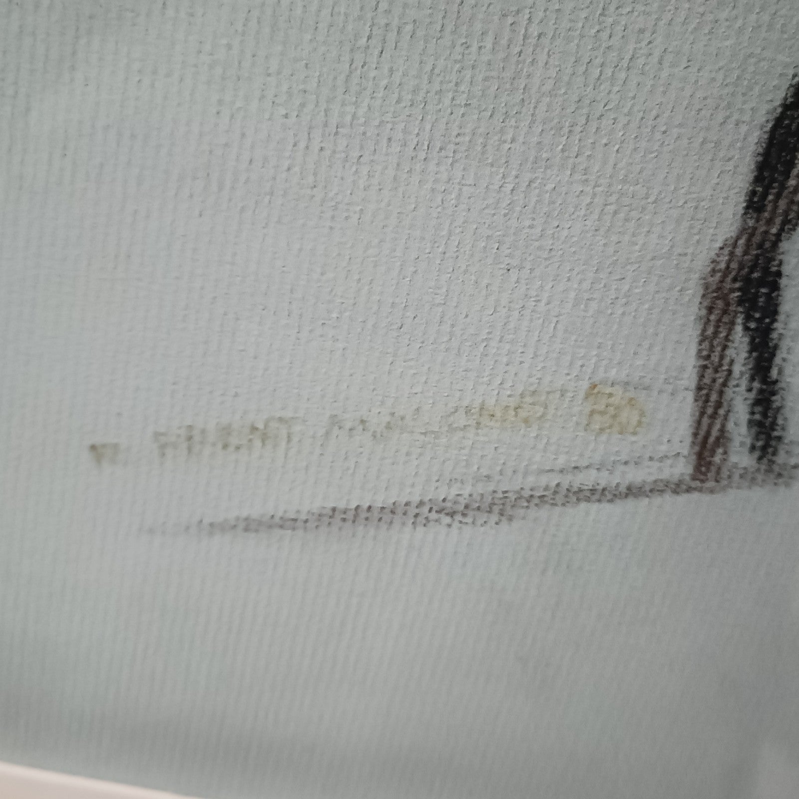 This very rare charcoal drawing by Richard Brent Malone presents a striking study of a knotted ship’s sail, suspended and entangled in a complex web of ropes, pulleys, and metal hardware. Rendered with meticulous realism, the composition captures the tension and weight of the fabric as it twists and folds under strain—its weathered texture evoking both the physical labour of seafaring and the poetic symbolism of entrapment and resilience. The muted blue backdrop contrasts with the earthy tones of the sail and rigging, heightening the drama of the suspended form. Though Malone is best known for his vibrant depictions of Bahamian culture, this monochromatic work reveals his technical mastery and his ability to imbue even utilitarian subjects with emotional depth and narrative intrigue. It may have served as a meditative study or conceptual exploration, offering a rare glimpse into the artist’s quieter, more introspective practice.