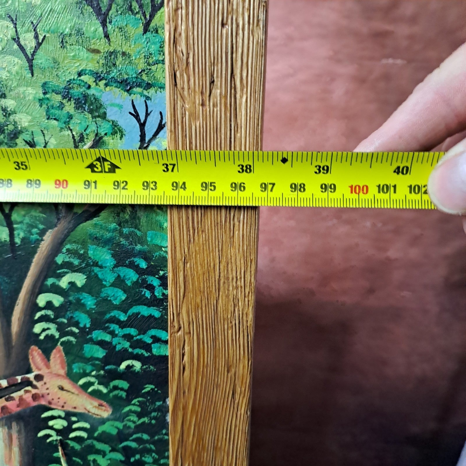 The product is a large oil painting on board by artist RODRIGUE MERVILUS, born in 1947. The artwork depicts a colourful jungle scene with wild animals such as zebras, rabbits, deer, and giraffes. Signed by the artist, this original piece is framed and features a unique one of a kind (OOAK) style, combining elements of Haitian art with a focus on animals and nature. Measuring 60cm in height and 90cm in width, this vibrant painting captures the beauty and diversity of the jungle landscape.