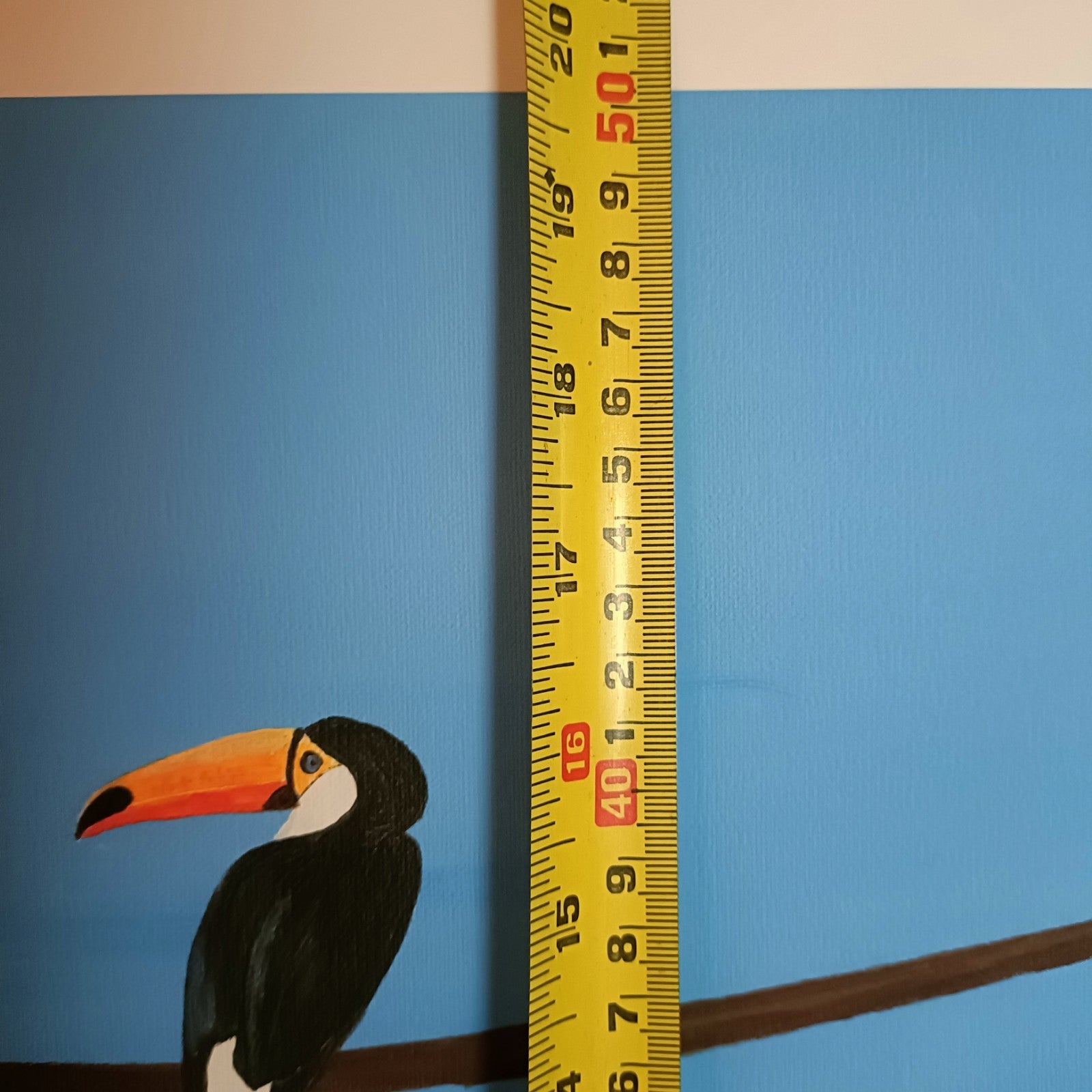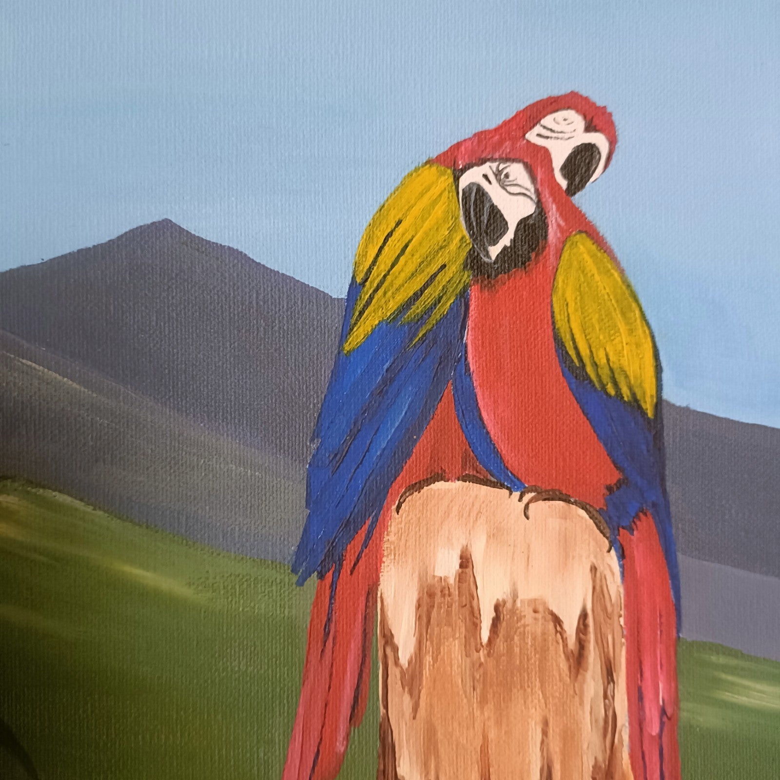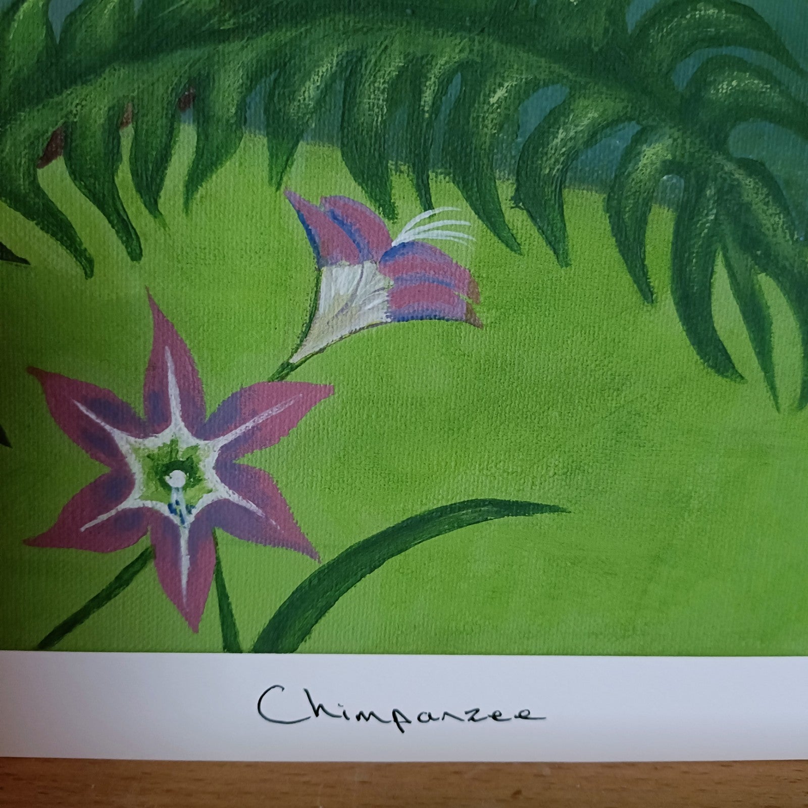Chimpanzee is a vibrant limited edition print that captures the exuberance of tropical wildlife in a lush jungle setting. A playful chimpanzee swings from a vine while a toucan and two parrots perch amid dense foliage, framed by green mountains and a brilliant blue sky. The composition bursts with saturated colour and rhythmic movement, evoking the vitality of rainforest ecosystems. Numbered and signed indestinctly by the artist, this UK-produced print blends illustrative charm with naturalistic detail, making it a striking addition for collectors of British wildlife art or tropical-themed interiors.