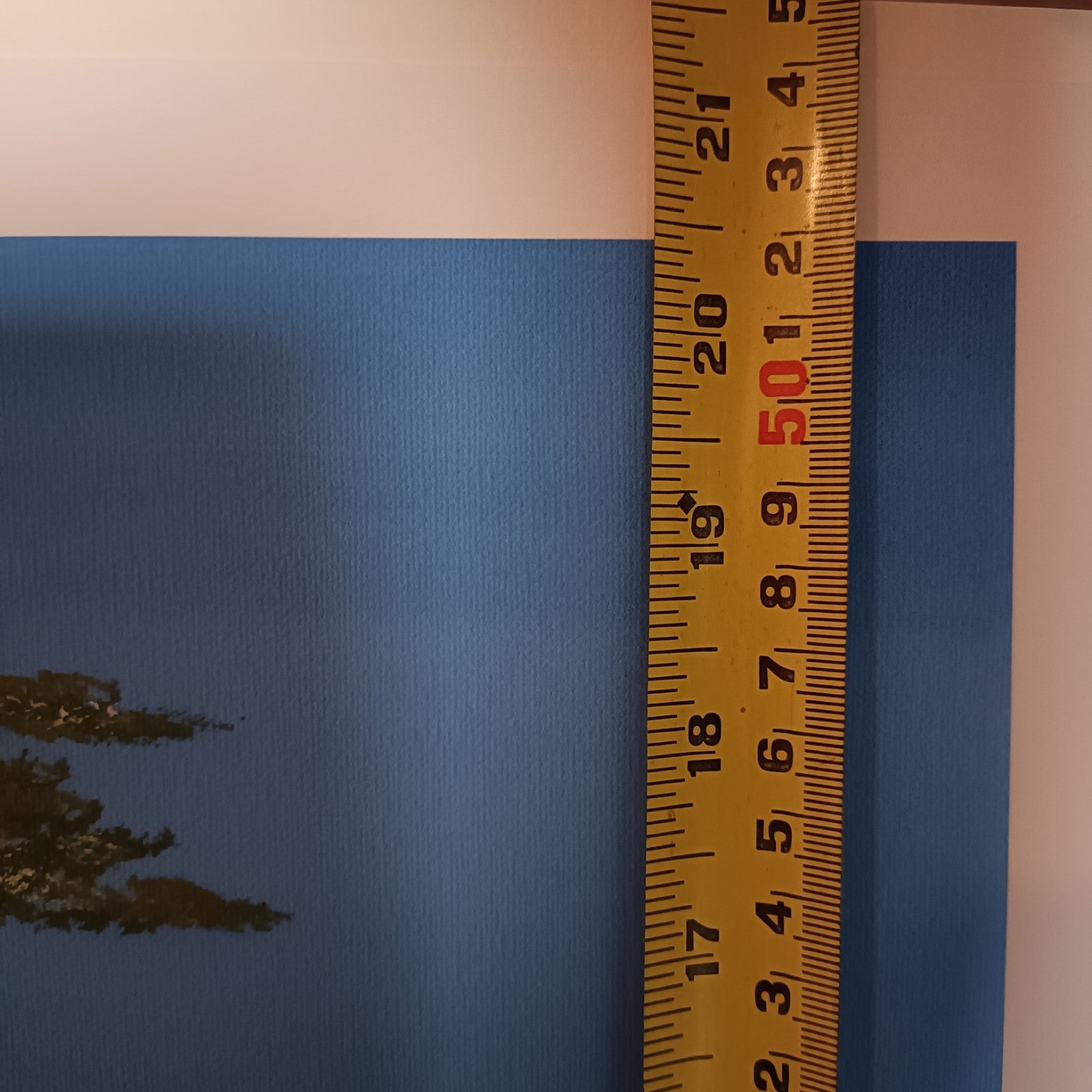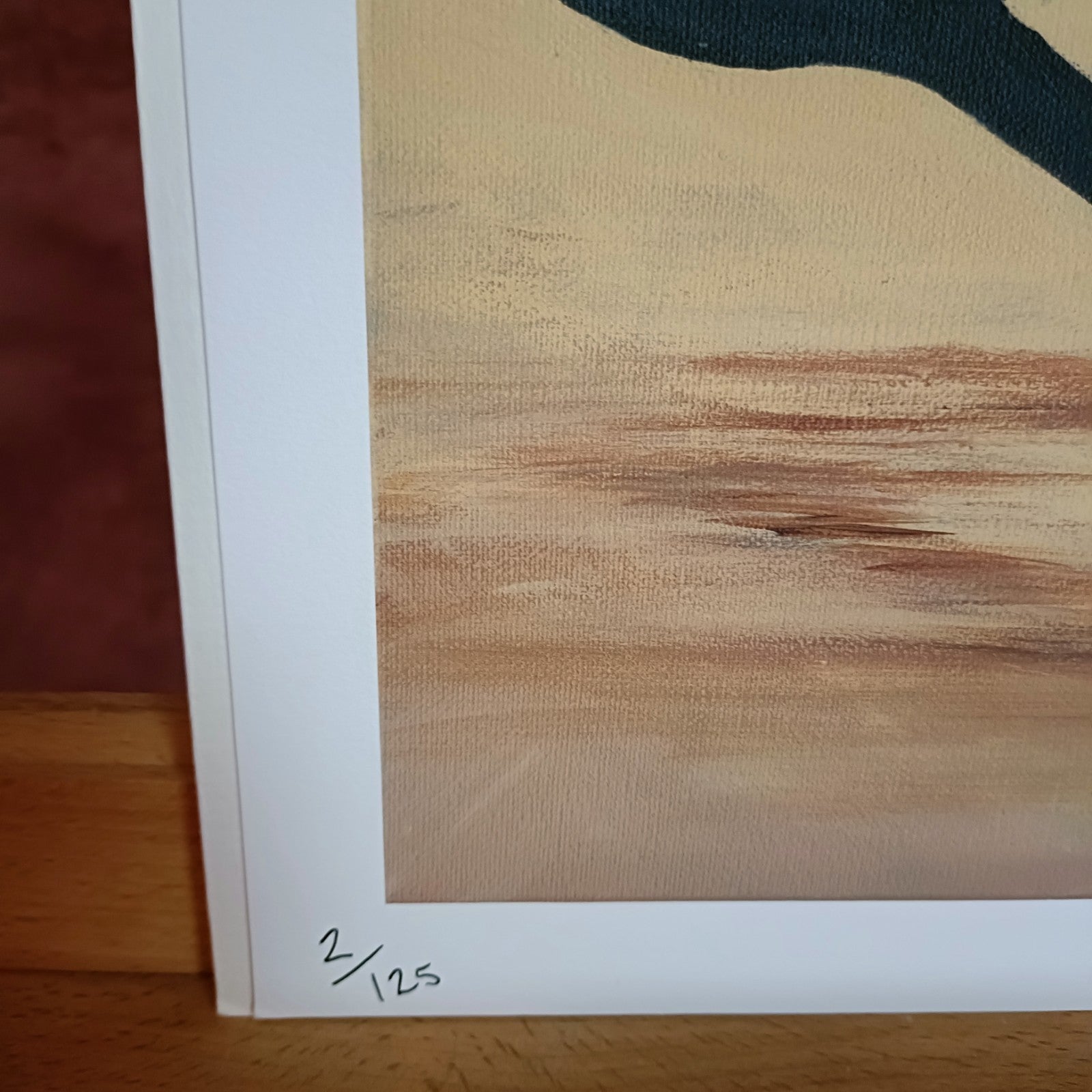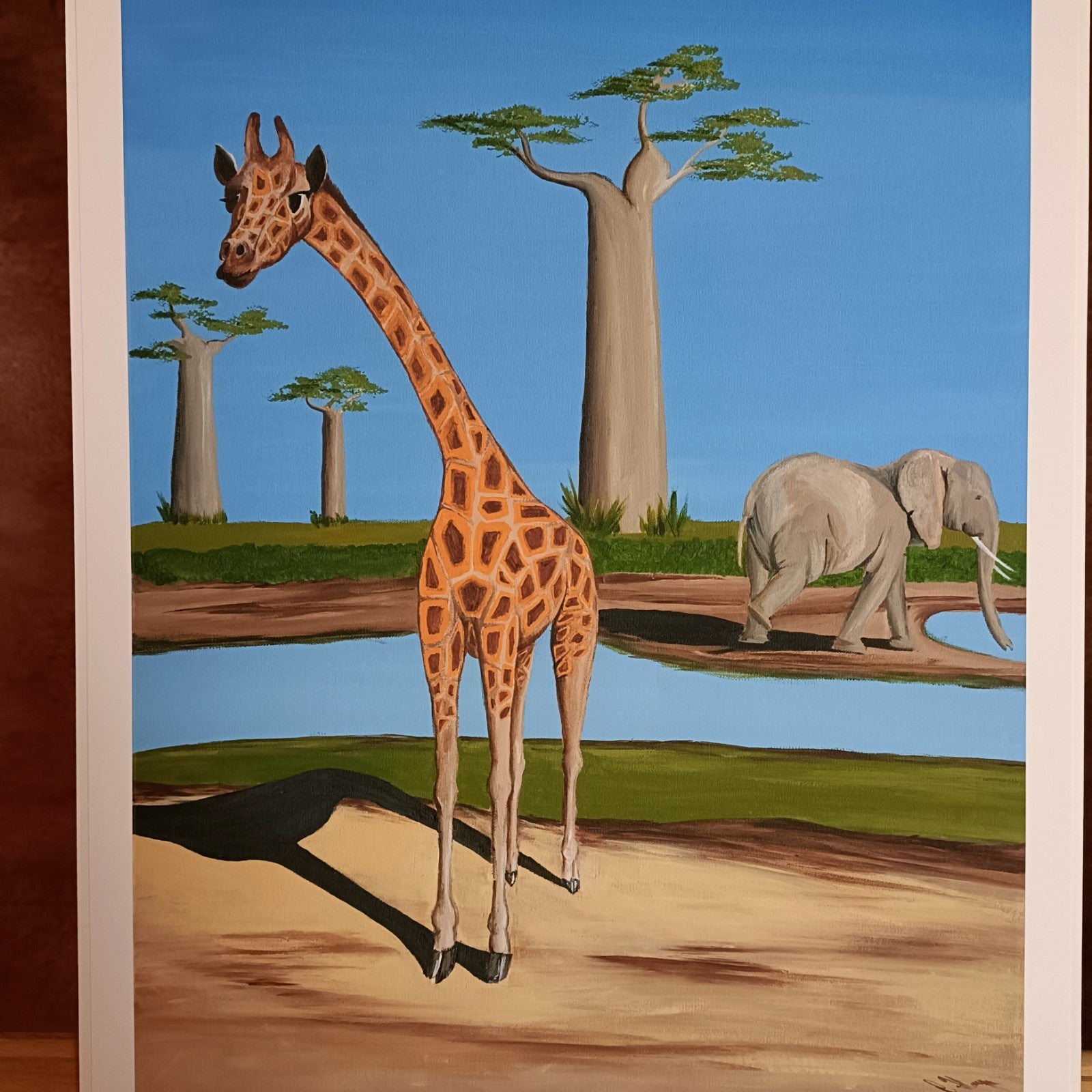 "Giraffe" captures the quiet majesty of the African savanna in a moment of sunlit stillness. A lone giraffe stands poised in the foreground, its elongated form casting a graceful shadow across sandy terrain. Behind it, an elephant ambles near a shimmering body of water, framed by the iconic silhouettes of baobab trees. The artist’s palette of warm ochres and cool blues evokes both the heat and serenity of the landscape, while the composition balances intimacy with grandeur. Though the signature remains indistinct, the work reflects a practiced hand and a reverence for wildlife, rendered with both realism and lyrical charm.