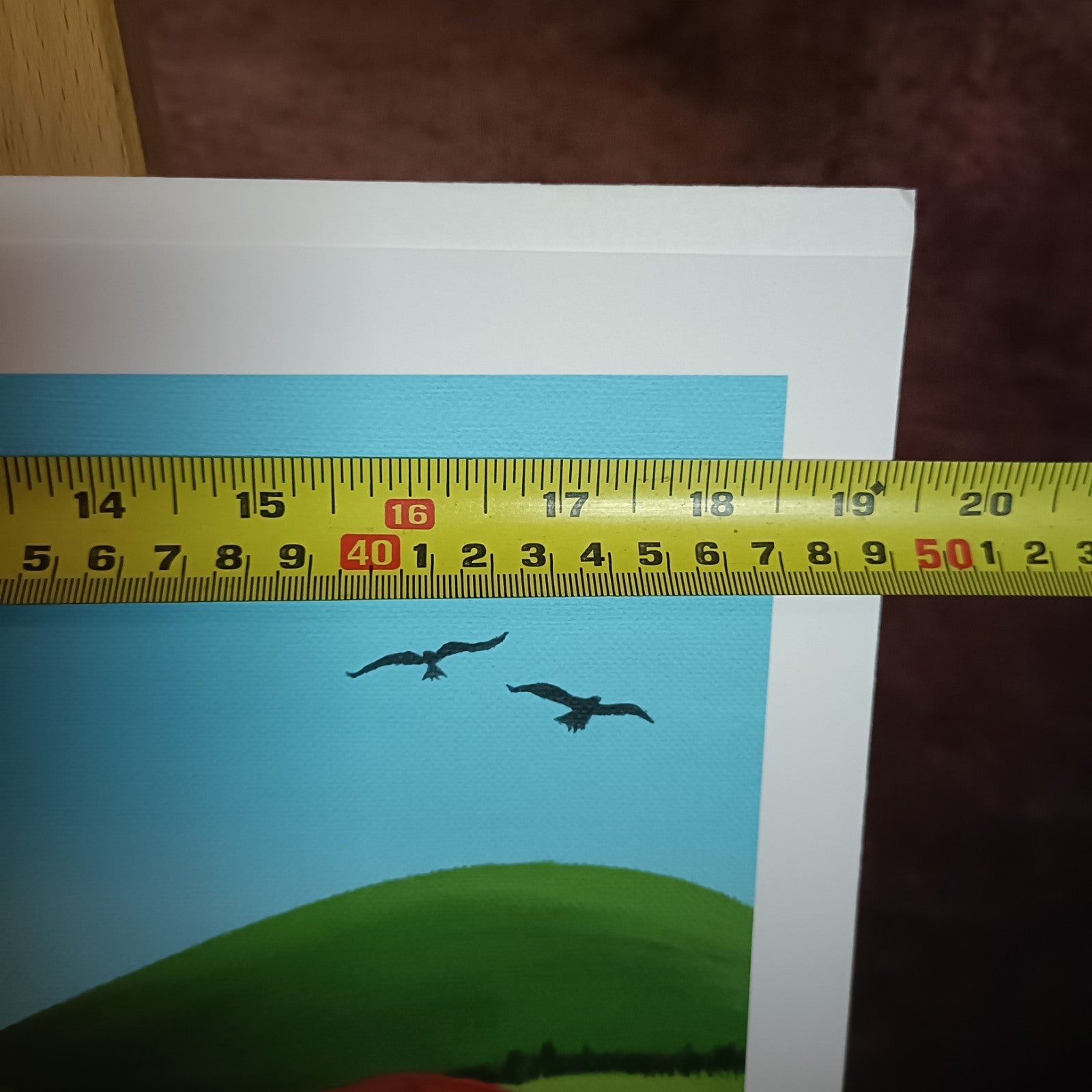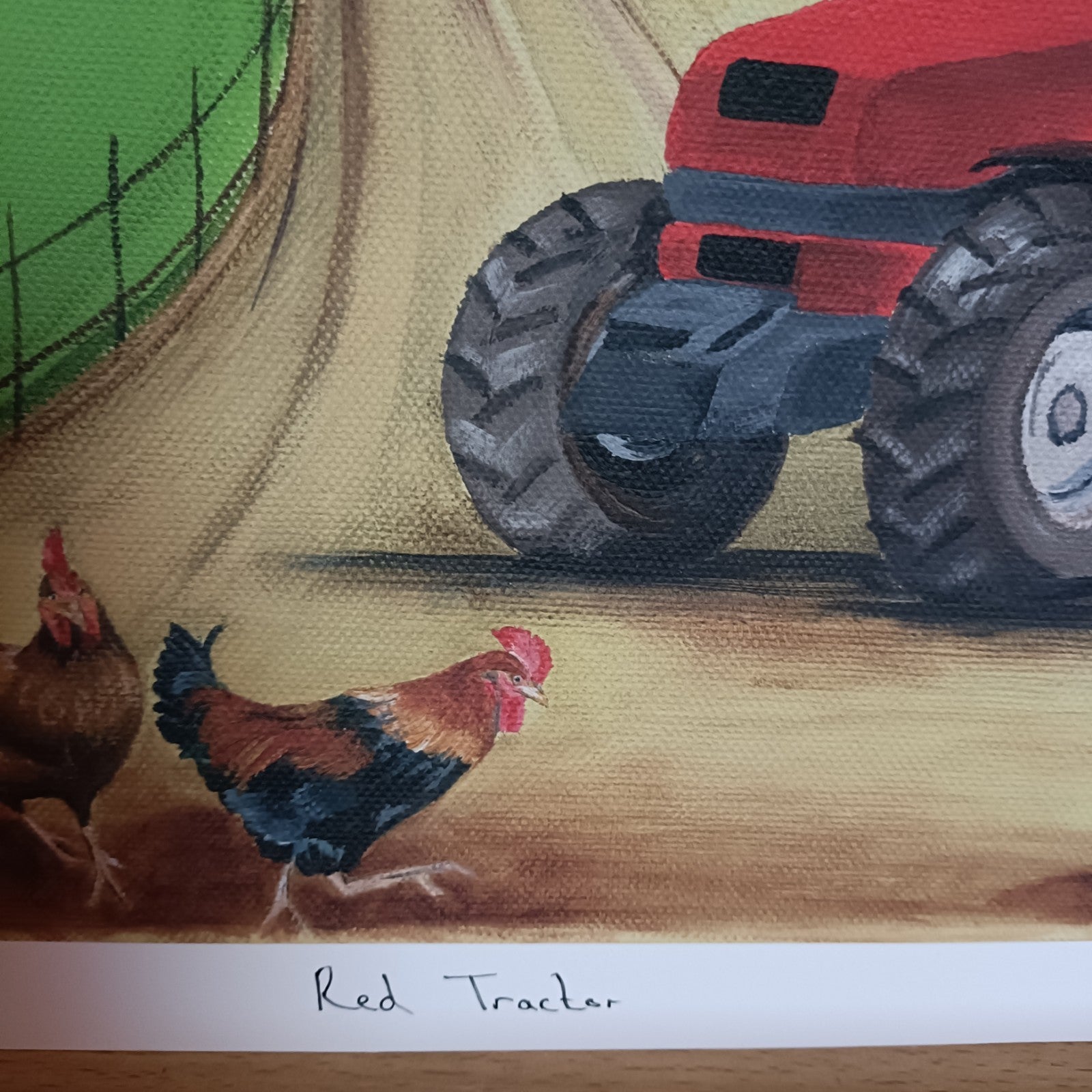 A charming depiction of British countryside life, this limited edition print features a red tractor navigating a winding dirt road through green hills. Chickens and roosters scatter in the foreground, while a border collie herds sheep near a rustic barn. The scene captures the rhythm and warmth of rural farm life. Numbered and signed by the artist, this UK-produced print blends illustrative charm with naturalistic detail, making it a striking addition for collectors of British farm art or farm-themed interiors.