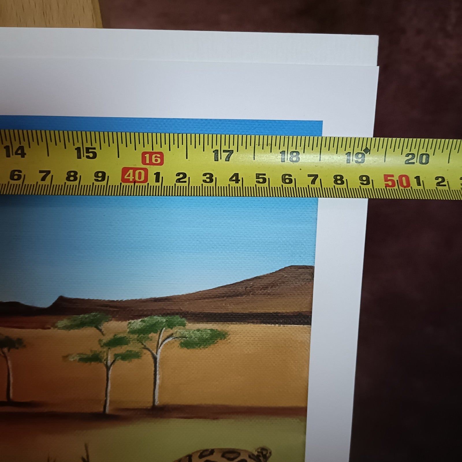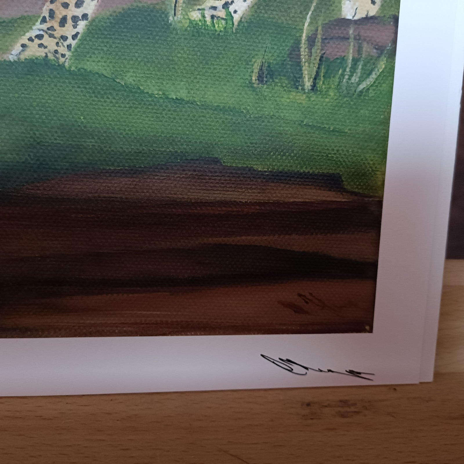 A tranquil yet vivid portrayal of African wildlife, this limited edition print captures a leopard stalking prey from the high ground while African wild dogs stand alert nearby. A grazing wildebeest anchors the middle ground, set against a sweeping savannah dotted with acacia trees. The scene evokes both the beauty and quiet tension of the wild. Numbered and signed by the artist, this UK-produced print blends illustrative charm with naturalistic detail, making it a striking addition for collectors of British wildlife art or tropical-themed interiors.