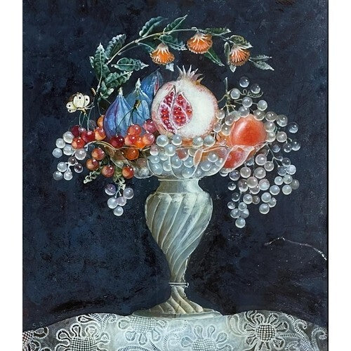Stunning Suzy Bartolini (1930-2011) Genuine Original. La Grenade Eclater, signed, reverse painted under glass, 40cm x 34cm, within a frame with reverse painted glass panels of agate effect.