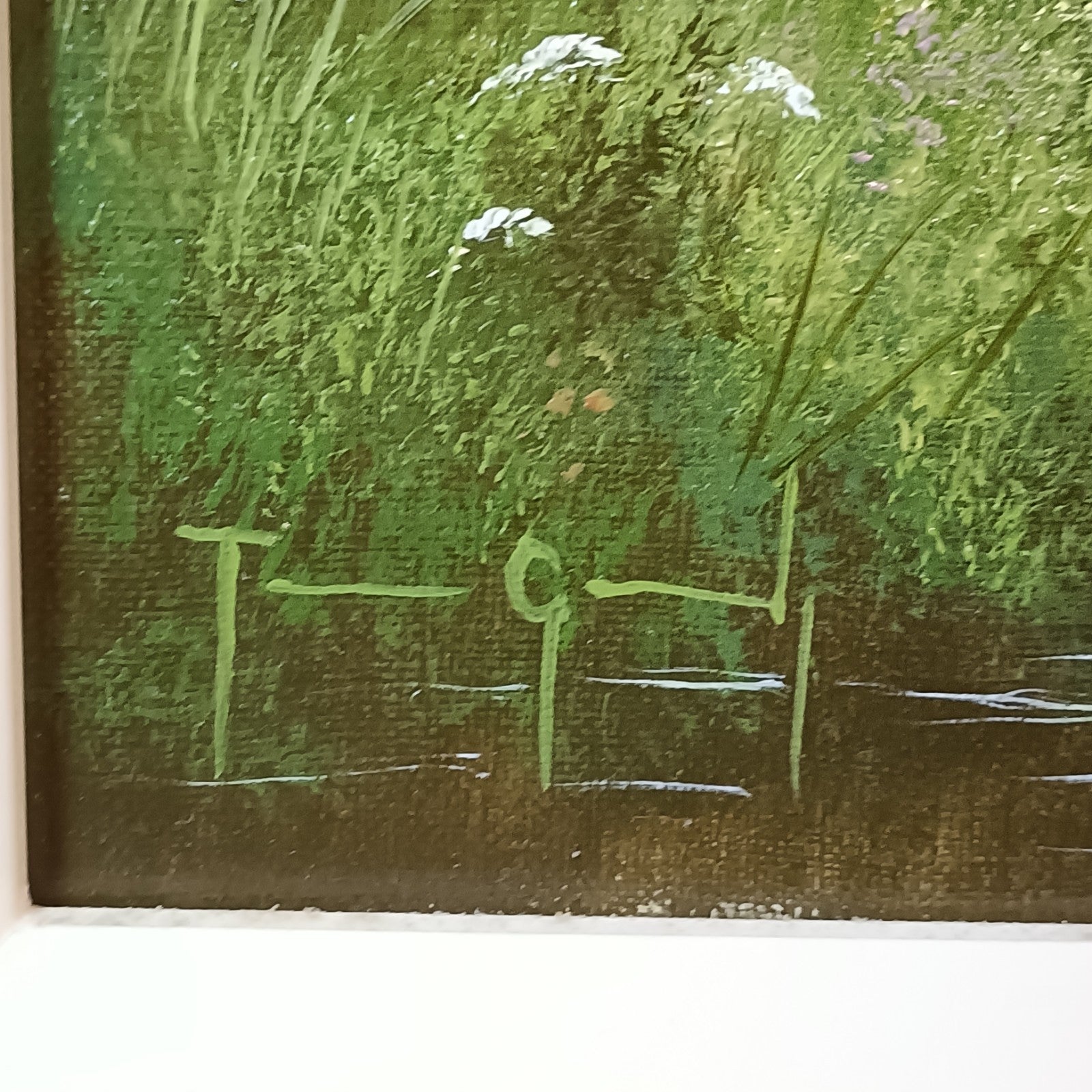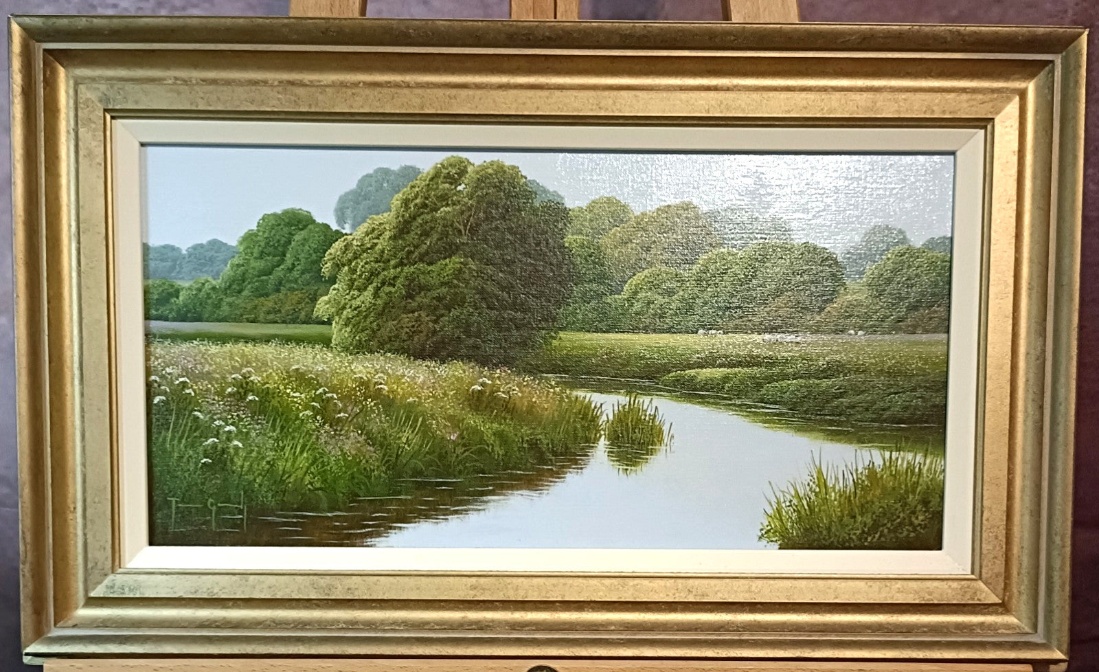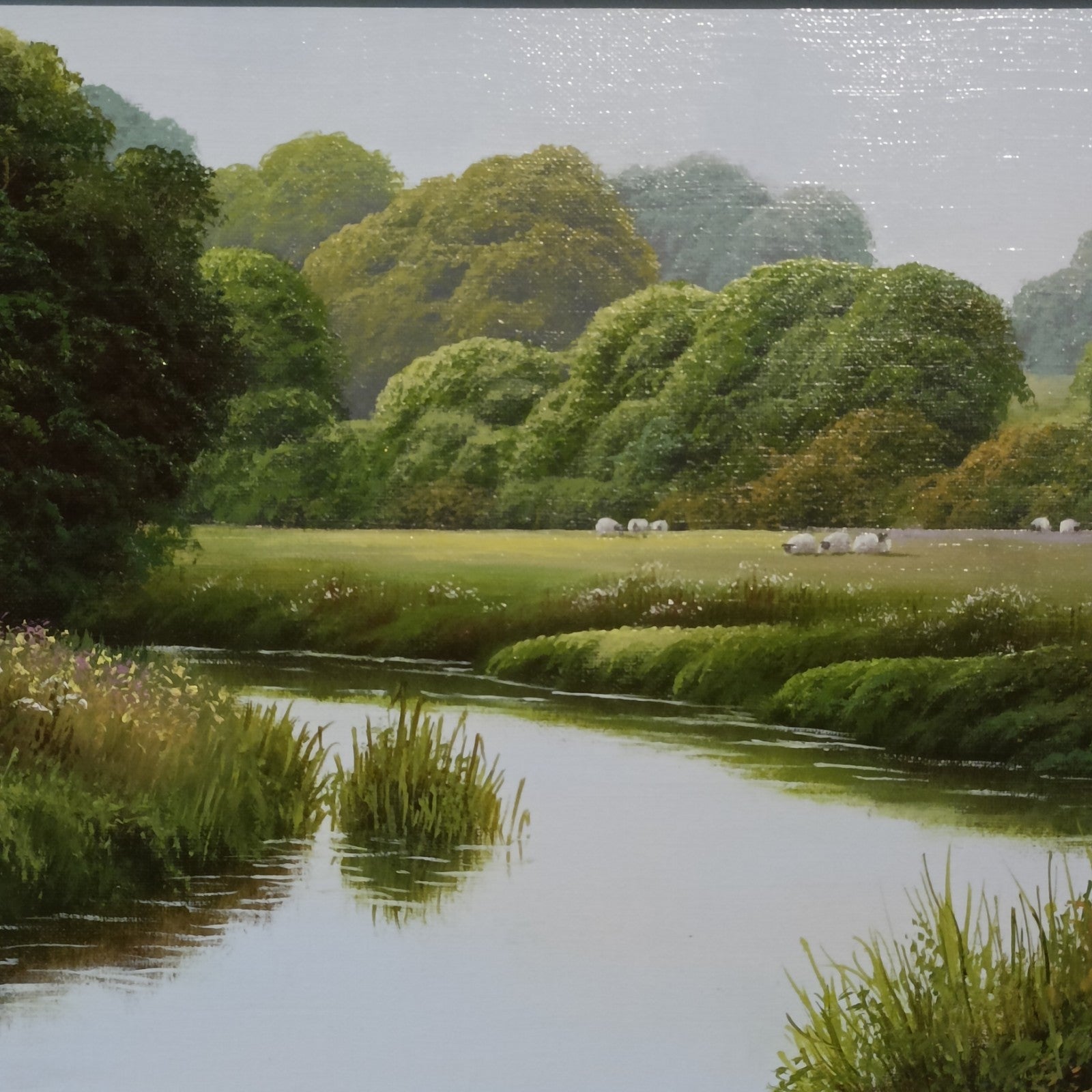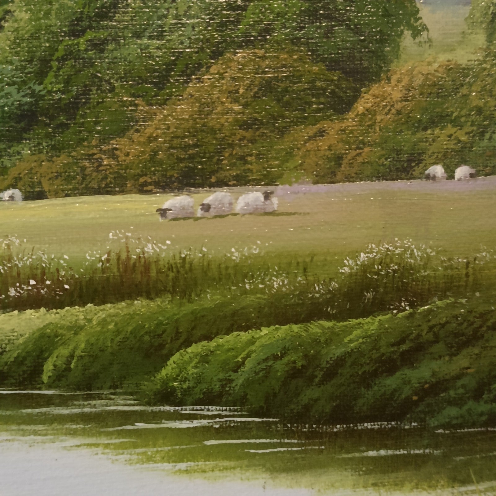 “Sheep Grazing” is a quiet moment captured with tenderness and clarity — a winding river flanked by wildflowers and soft greenery, with sheep nestled peacefully in the landscape. Terence Grundy’s brushwork brings out the stillness of the scene, where light dances on water and trees stand like gentle sentinels in the distance. The composition feels intimate yet expansive, inviting the viewer to linger and listen to the hush of nature. Signed Terence Grundy in the lower left, the painting reflects his deep affection for the English countryside and his gift for turning everyday rural life into something quietly poetic.
