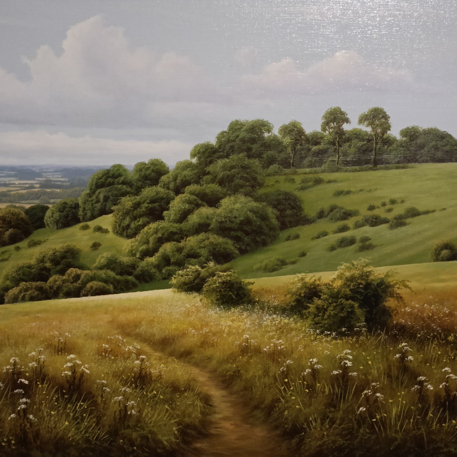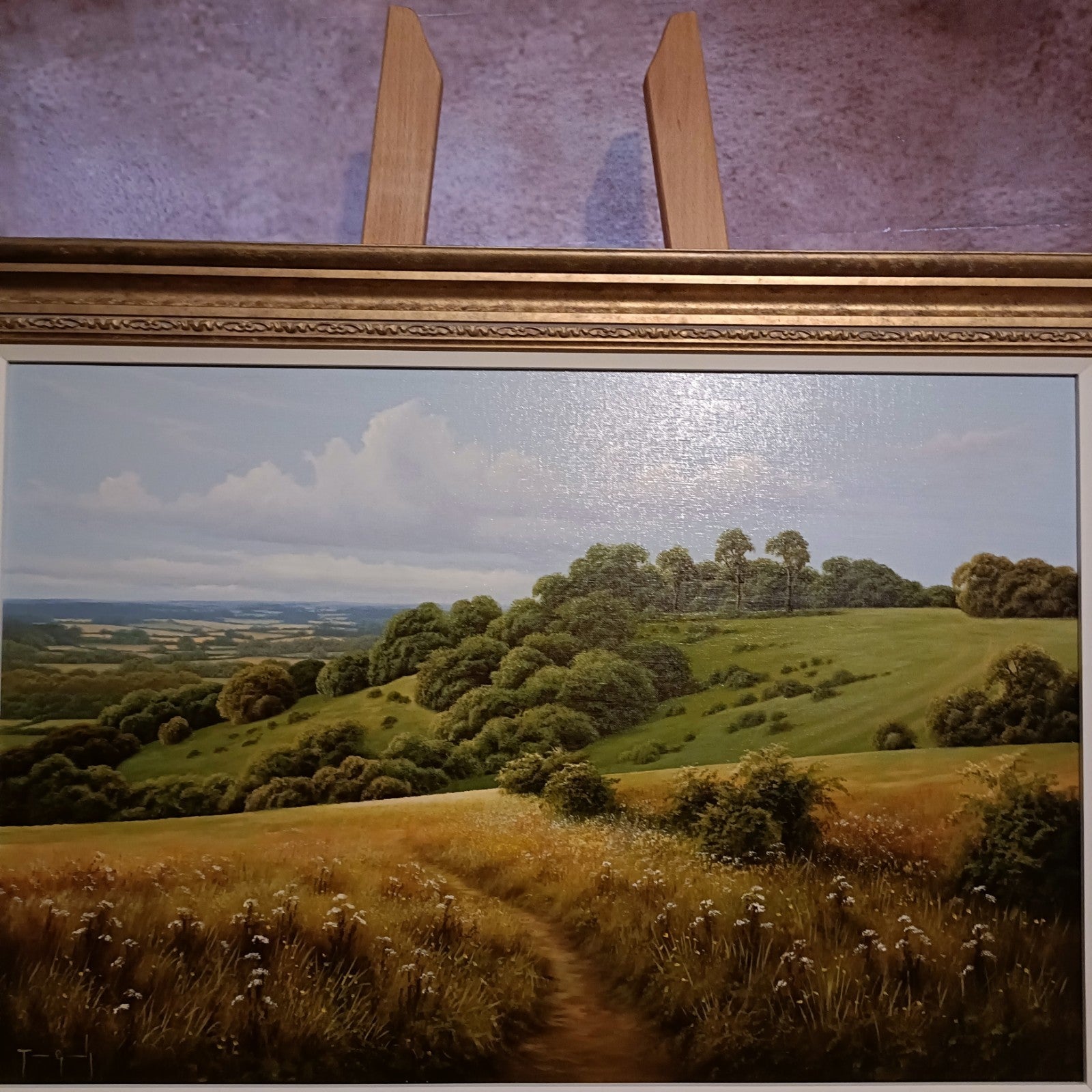 “Walk on the Downs” captures the serene majesty of the English countryside with remarkable clarity and depth. A winding path meanders through tall grasses and wildflowers, leading the eye toward distant hills framed by clusters of trees and a soft, cloud-streaked sky. Grundy’s meticulous brushwork and naturalistic palette evoke a sense of quiet immersion, as if the viewer were stepping into the landscape itself. The composition balances intimacy and grandeur, reflecting the artist’s signature ability to render rural scenes with photographic precision and poetic warmth. Framed in an ornate gilt moulding, the piece exemplifies Grundy’s mastery of traditional landscape painting and his enduring appeal among collectors of British art.