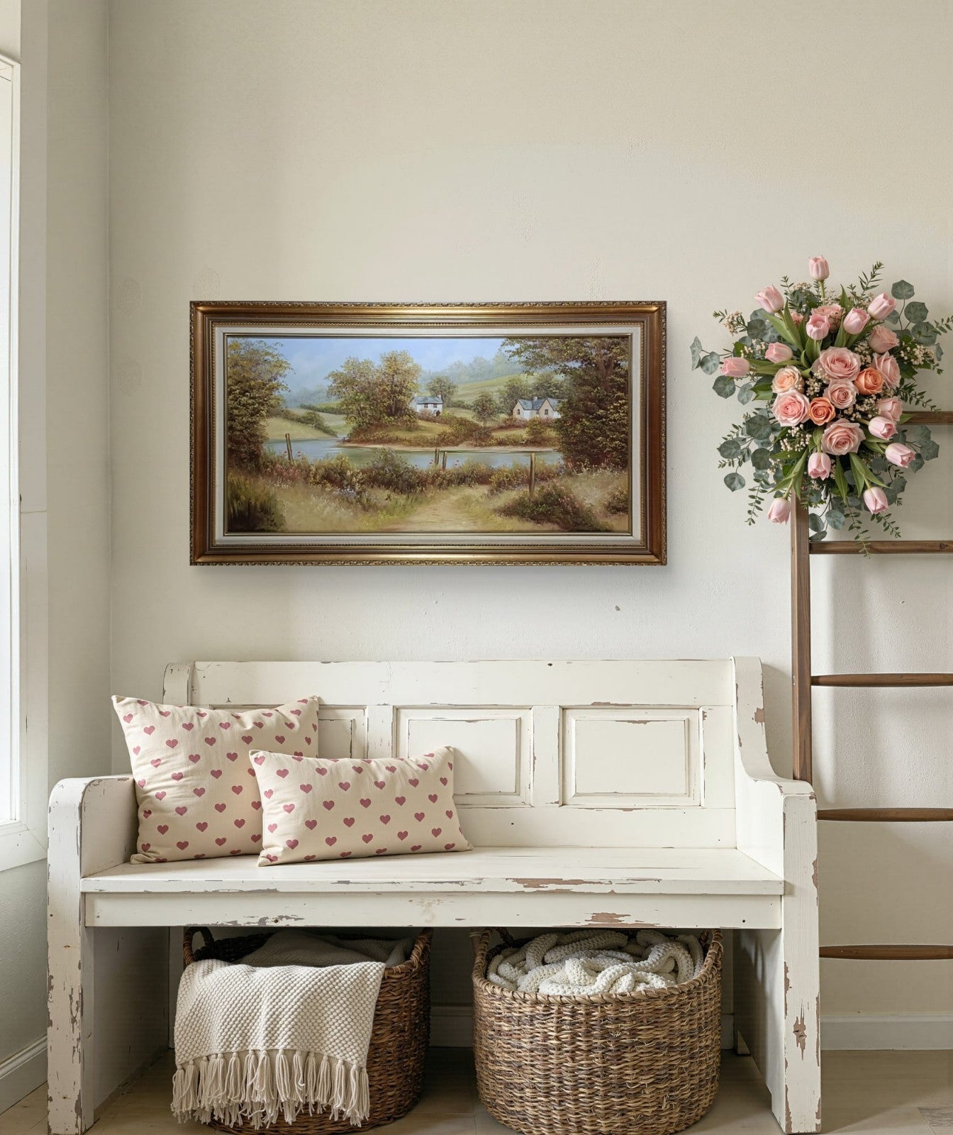 This serene countryside landscape by Terry Heath captures a peaceful rural path leading towards a still river bordered by wildflowers and soft grasses. Across the water, two whitewashed cottages nestle among lush greenery, framed by rolling hills and a gentle blue sky. Heath’s warm palette, gentle brushwork and nostalgic sense of place create a timeless, calming view of the British countryside at its most tranquil.