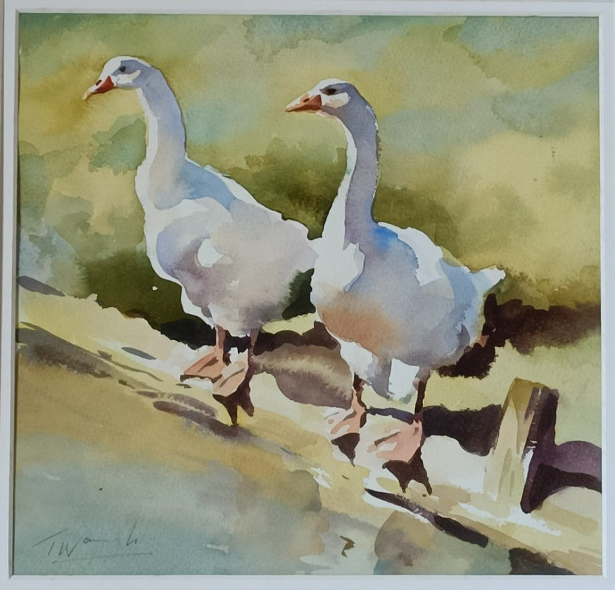 Trevor Waugh Small Original Watercolour Emden Geese Painting - Art.