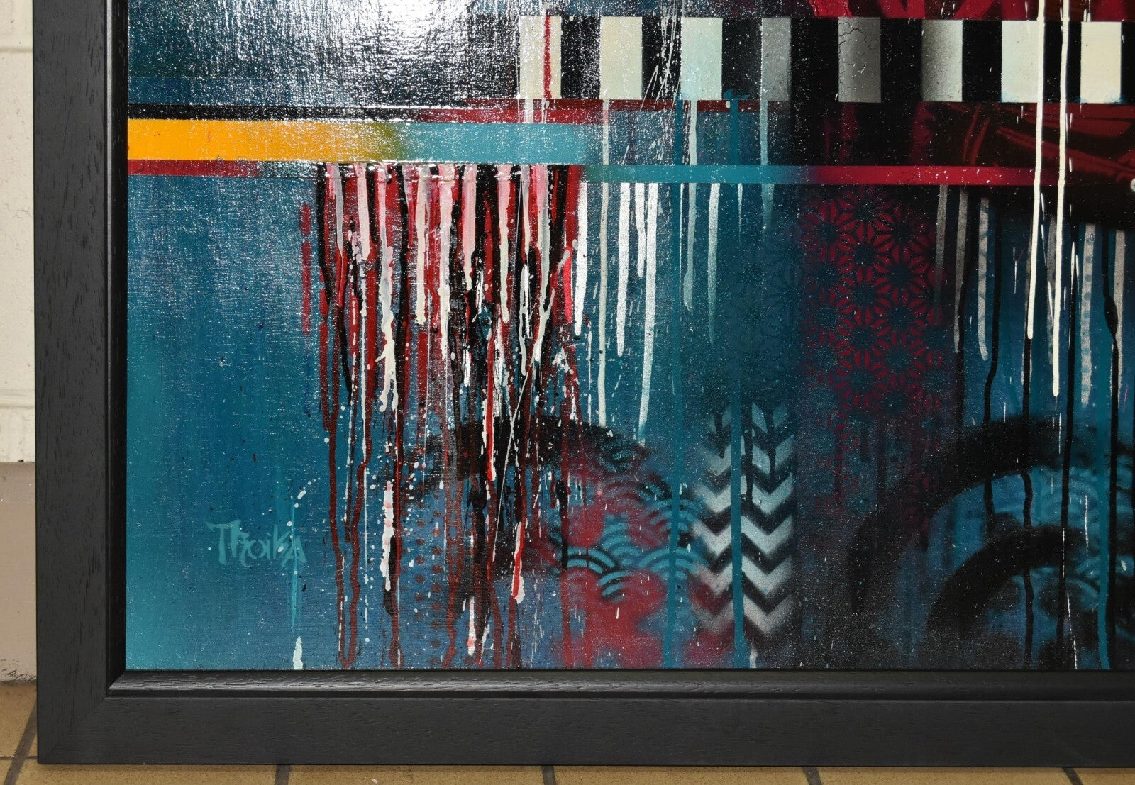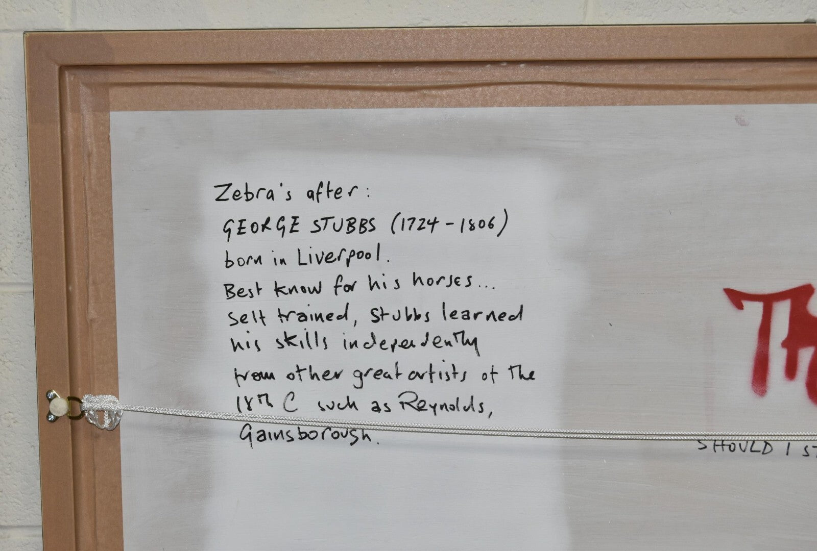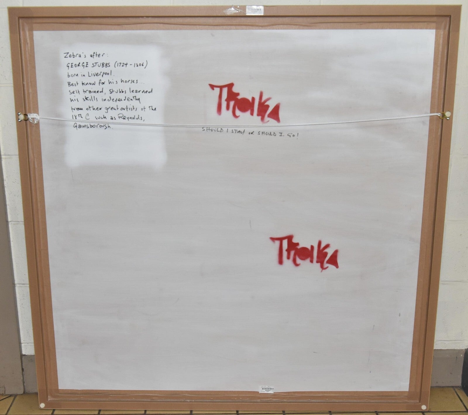 Delve into the contemporary artistry of Troika with their original mixed media painting titled "Should I Stay Or Should I Go". This piece is a captivating exploration of colour and texture, featuring a striking zebra subject that commands the viewer's attention. The artwork is thoughtfully crafted on board, boasting a large size of 154 cm in height and 132 cm in width, making it a statement piece for any gallery or living space. This original painting is complemented by a frame that enhances its presence and provides a touch of elegance. The artists have personally signed the work, adding an authentic touch that collectors and art enthusiasts value. With its dynamic style and expressive subject, it serves as a profound artistic expression that will resonate with those who appreciate the complexities of modern art.
