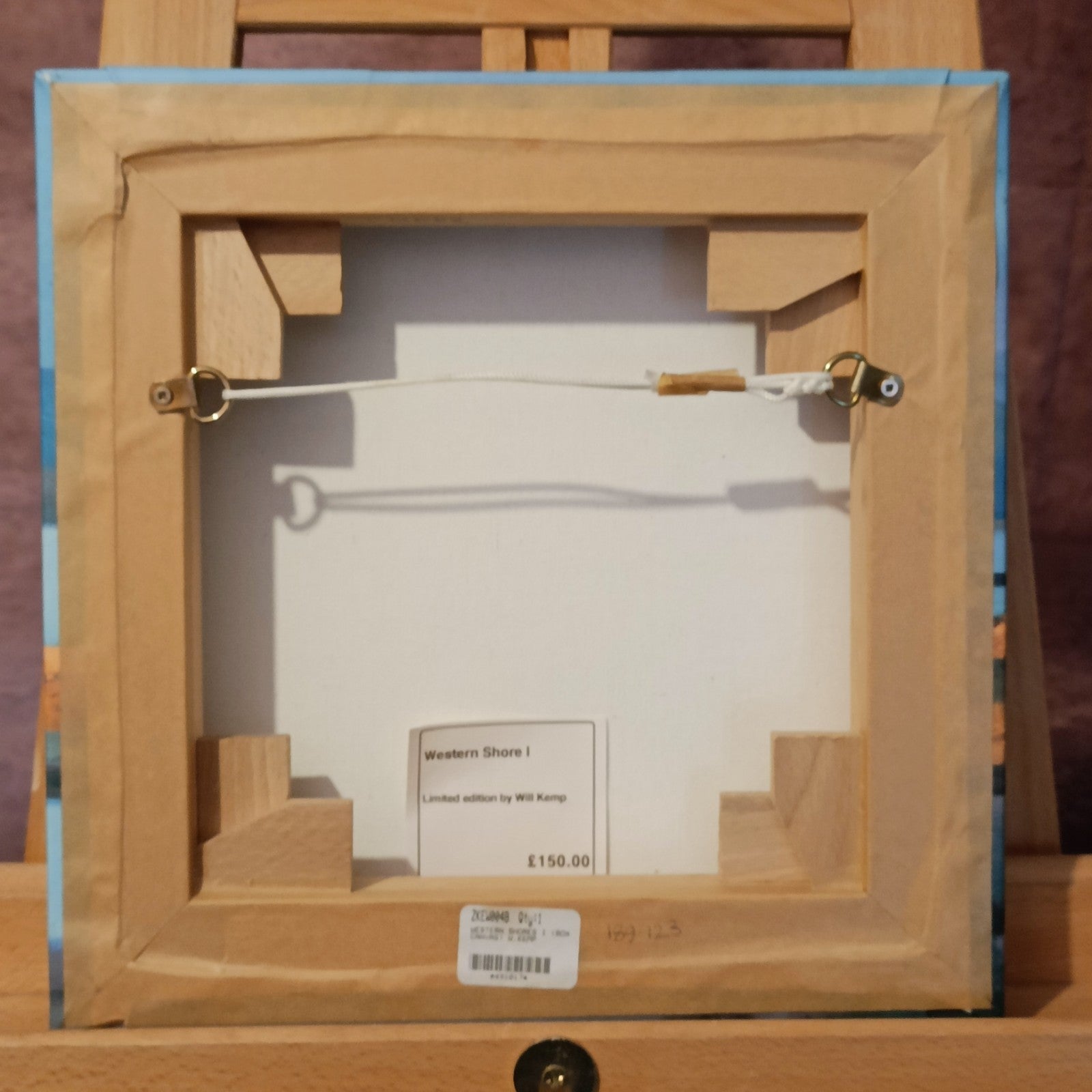 The product is a small giclée print on canvas by artist Will Kemp, titled "Western Shore I." This limited edition artwork features a western coastal theme, depicting elements such as a house, lake, sea, and shore. The print is numbered as 9 out of 20, making it a rare and unique piece for art enthusiasts. The artist proof adds an extra layer of exclusivity, making this a sought-after collectible for those appreciating Kemp's distinctive artistic style.