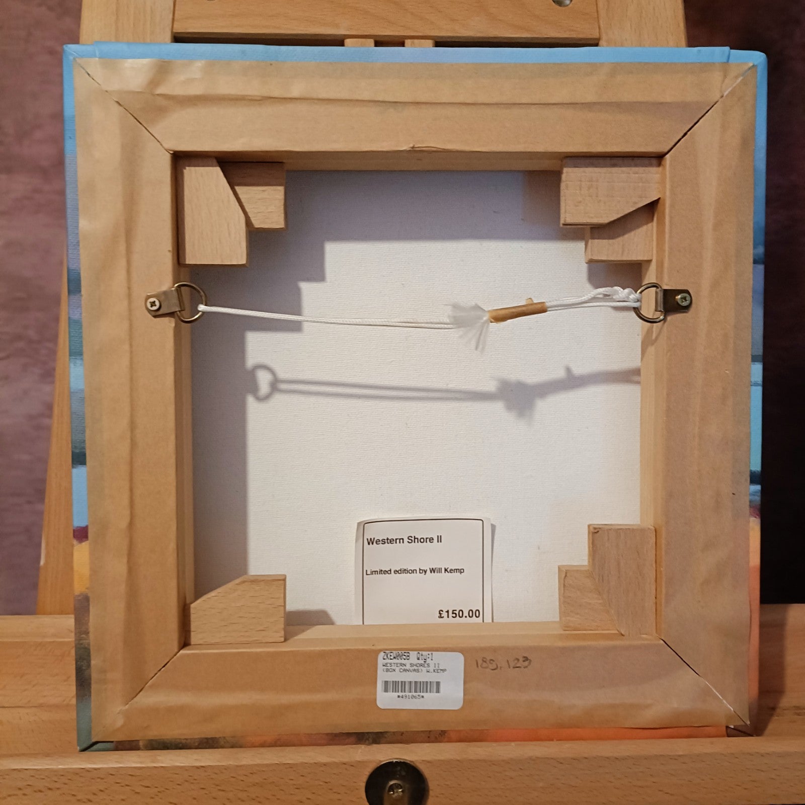 The product is a small giclée print on canvas by artist Will Kemp, titled "Western Shore I." This limited edition artwork features a western coastal theme, depicting elements such as a house, lake, sea, and shore. The print is numbered as 9 out of 20, making it a rare and unique piece for art enthusiasts. The artist proof adds an extra layer of exclusivity, making this a sought-after collectible for those appreciating Kemp's distinctive artistic style.
