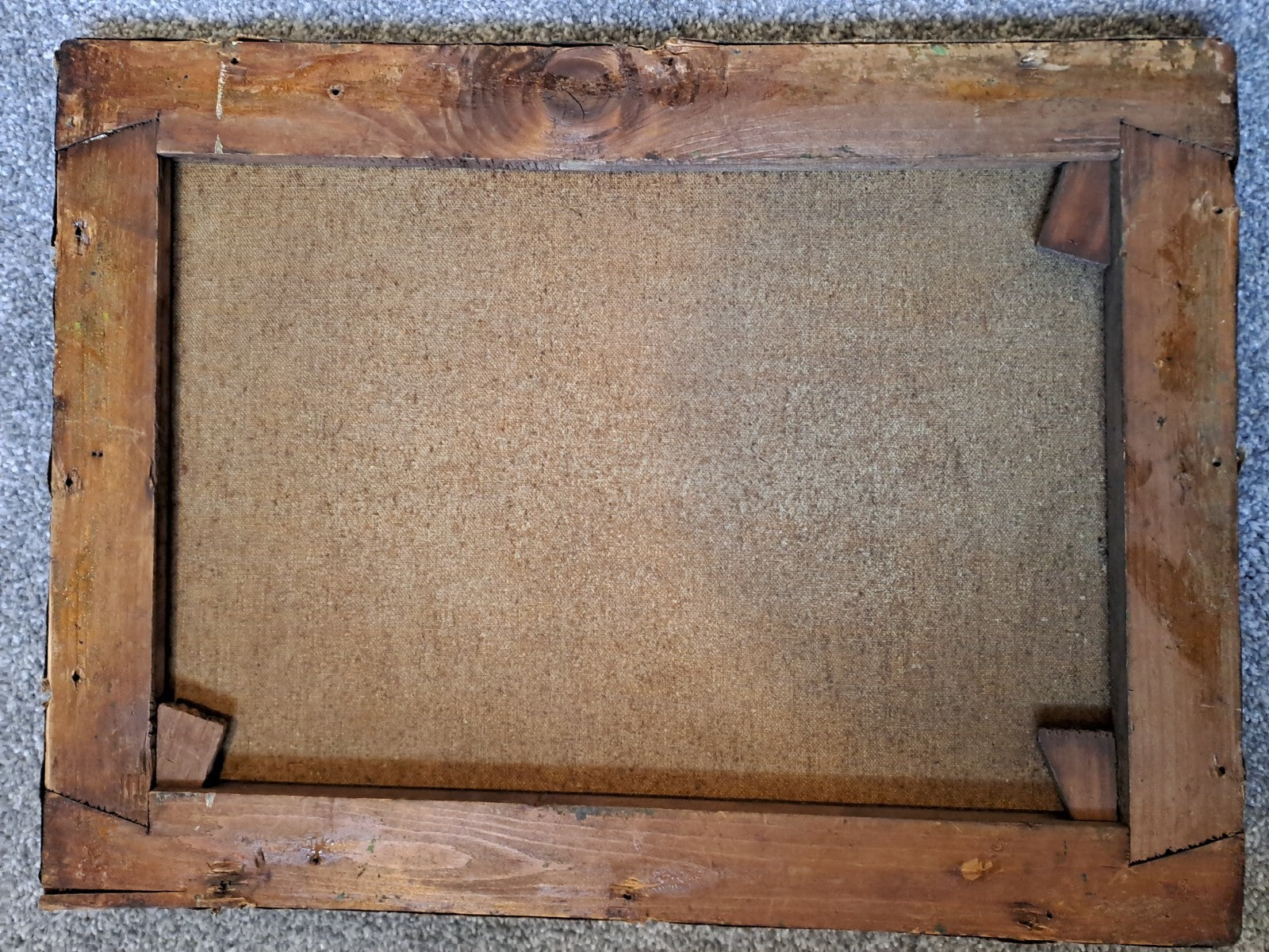 Image: Good. Outline of wooden stretch frame is visible. Unframed, unmounted, No mounting hardware.